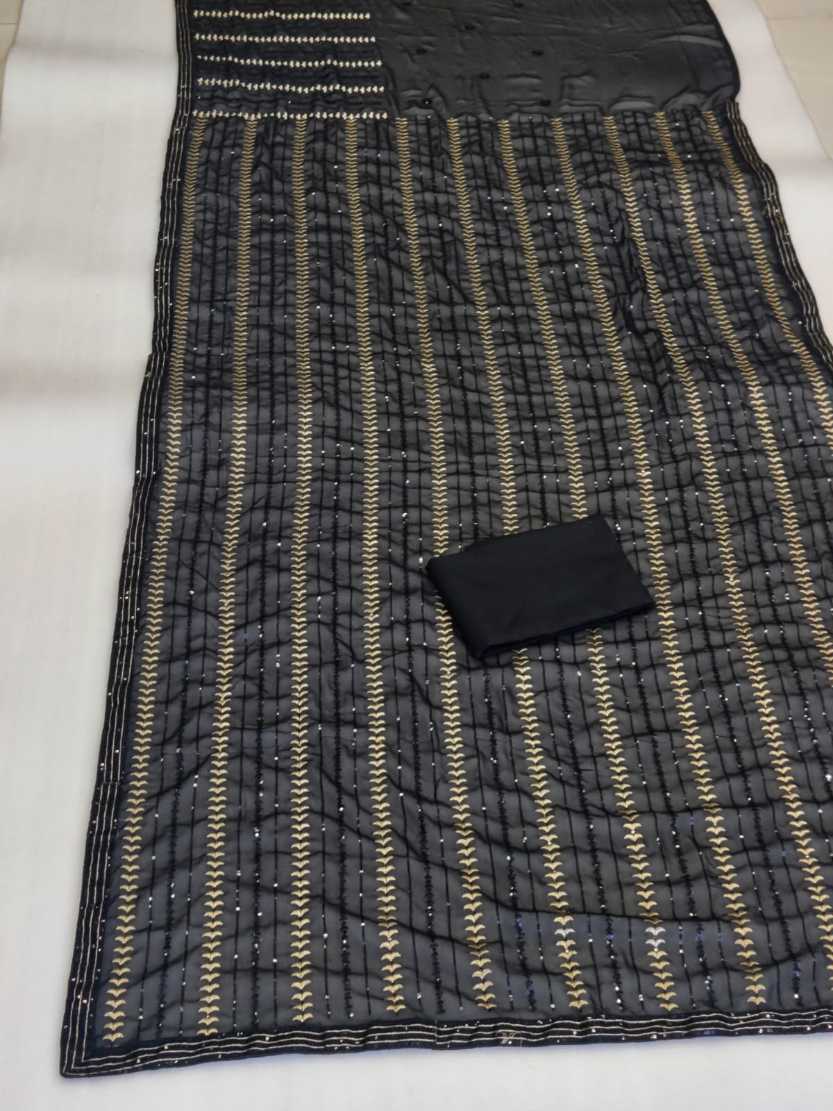 Add glam to your look with this Black Georgette Saree featuring sequins work, a lace border, and stylish piping finish. A head-turning piece for festive nights and special events.