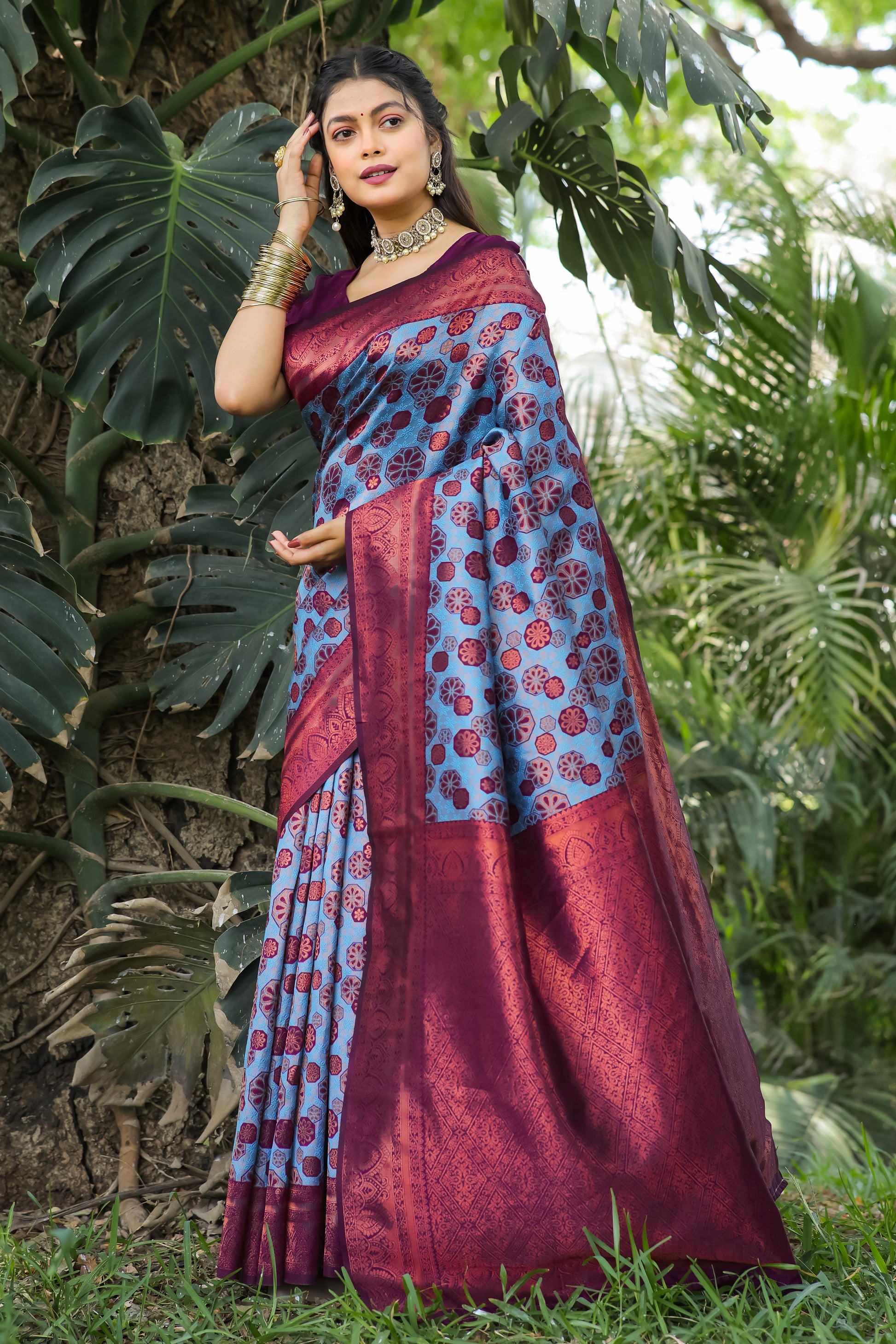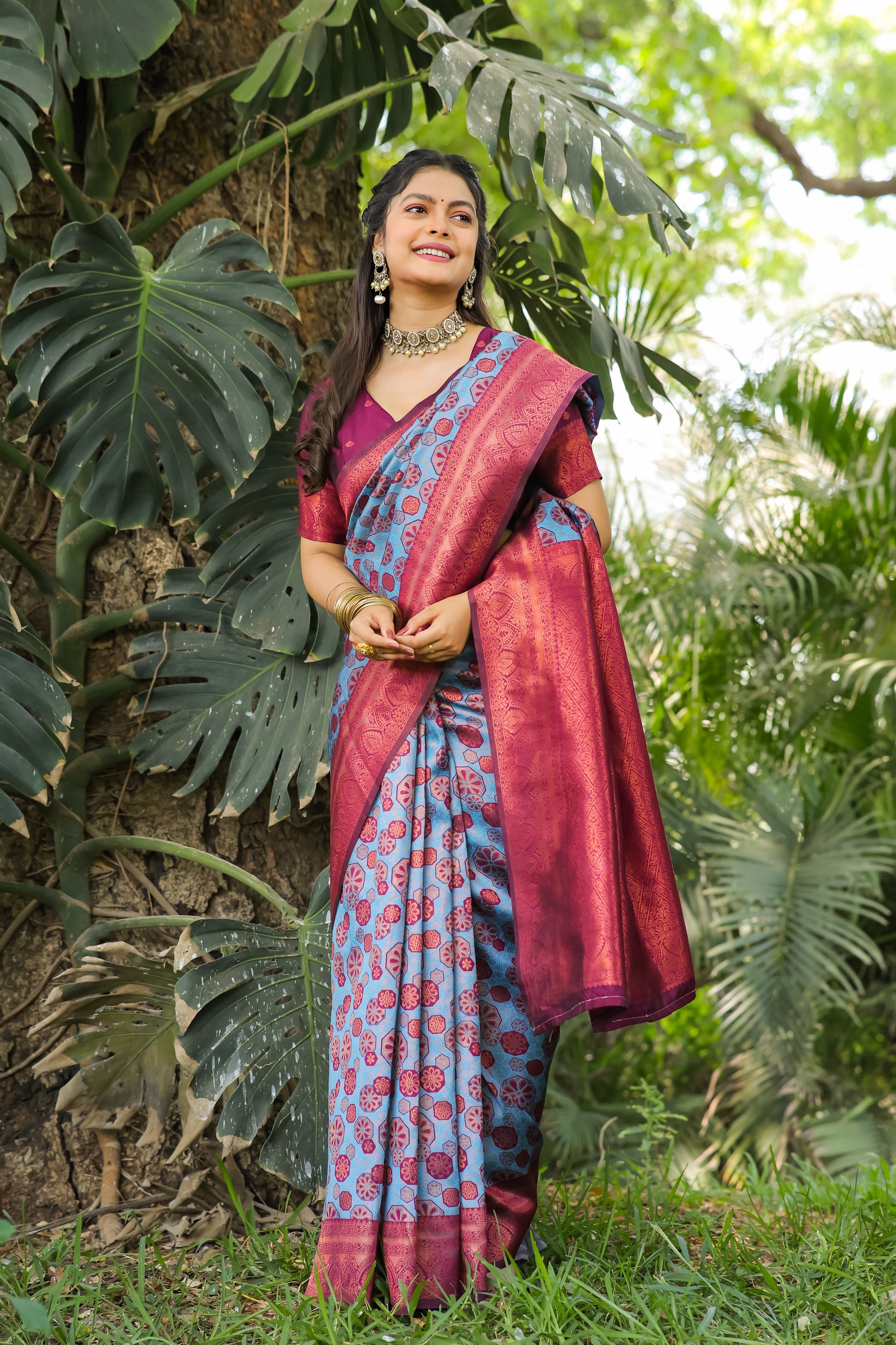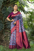 Blue Litchi Soft Silk Banarasi Saree with Floral Zari Woven