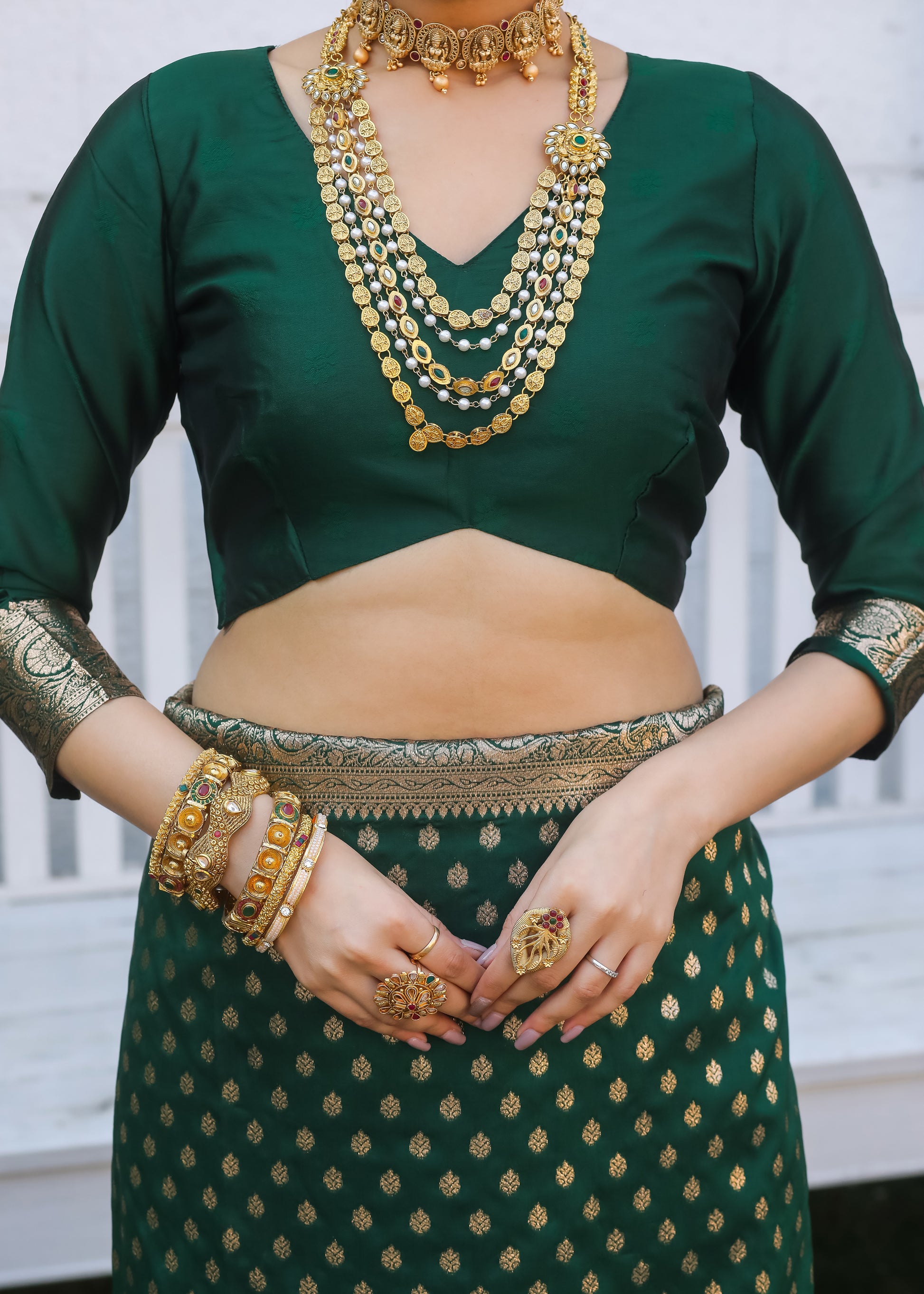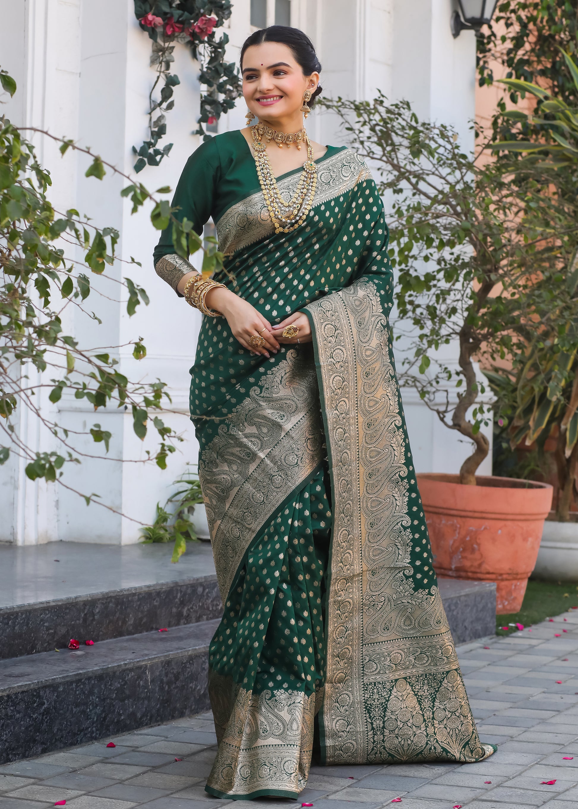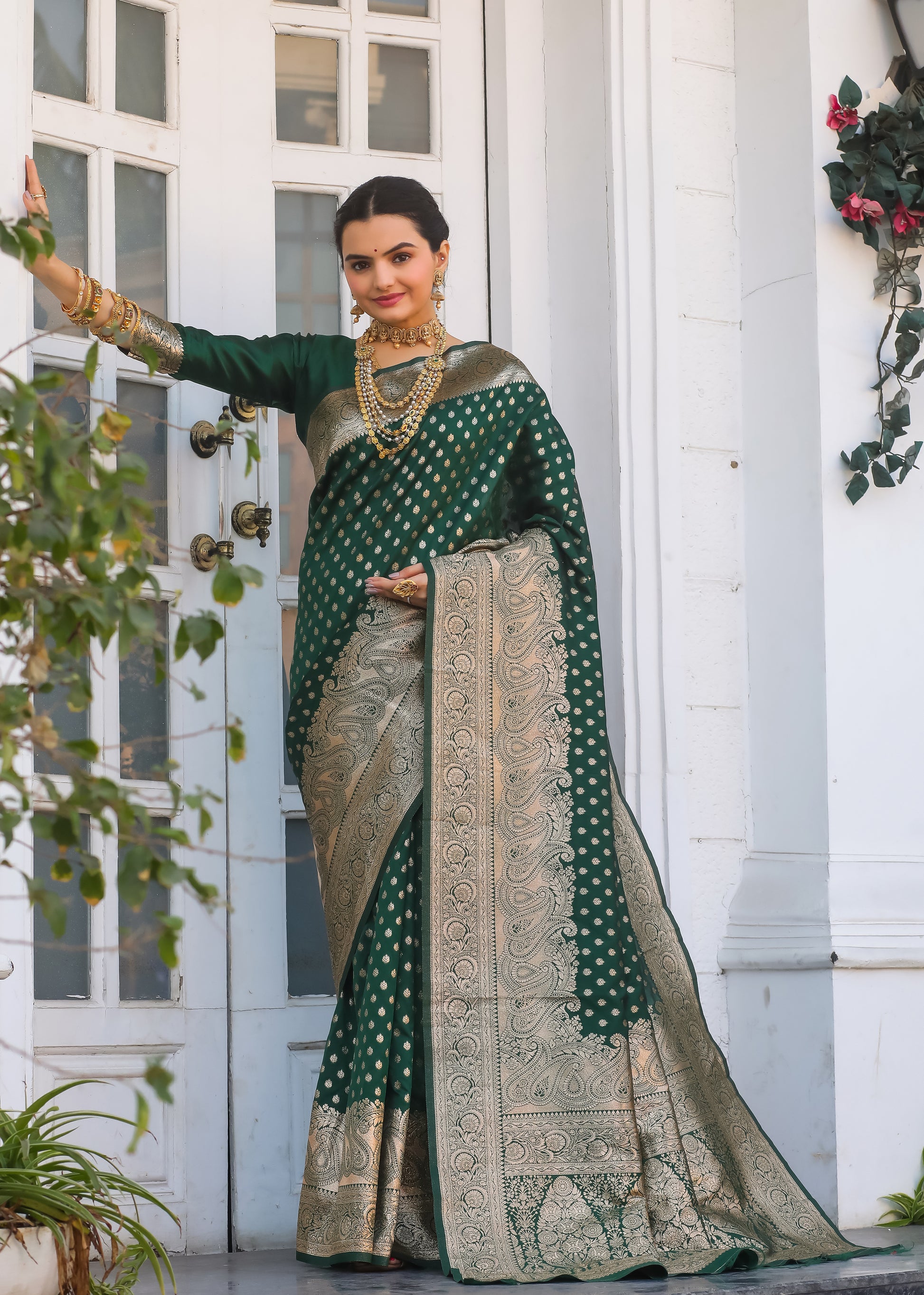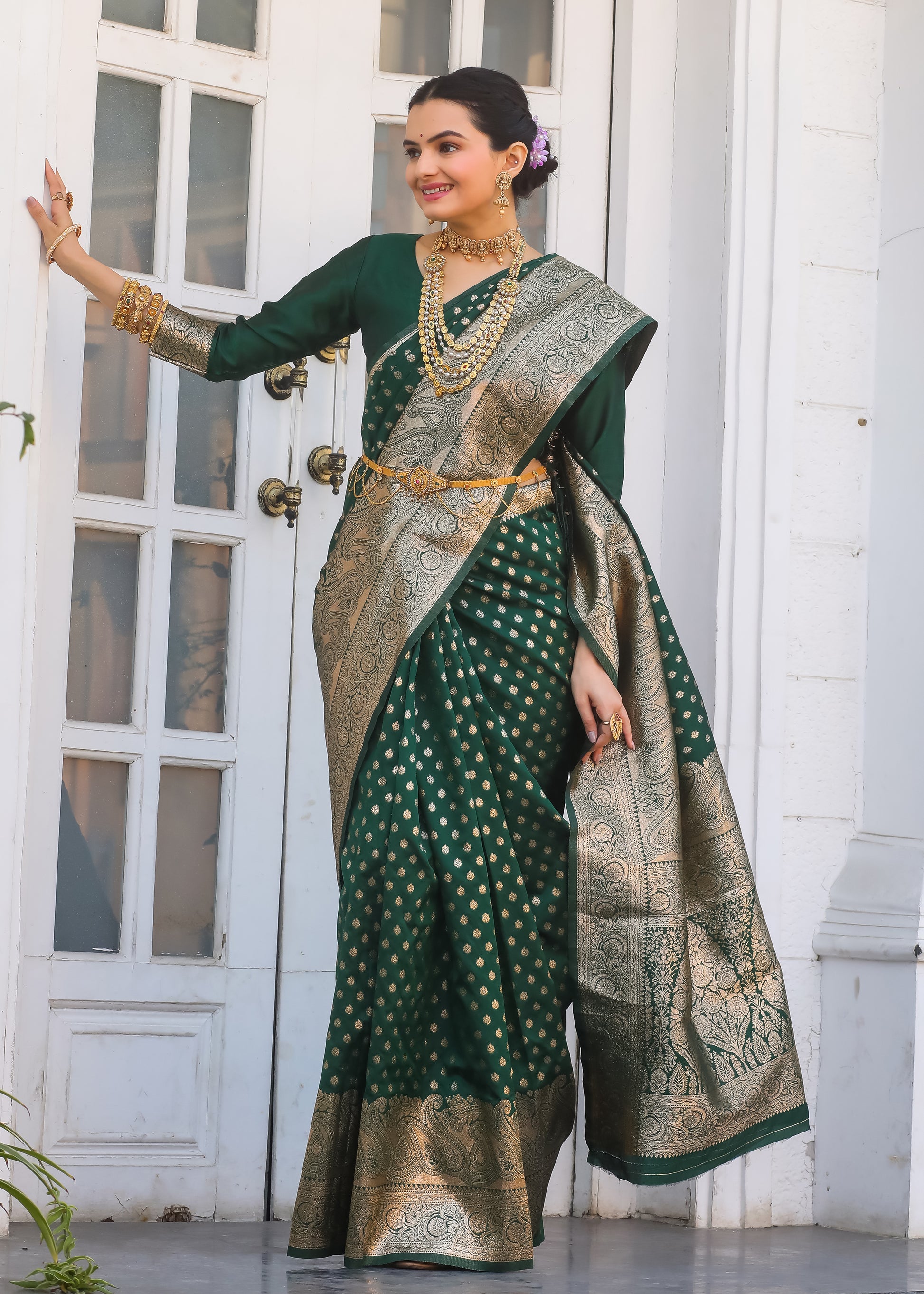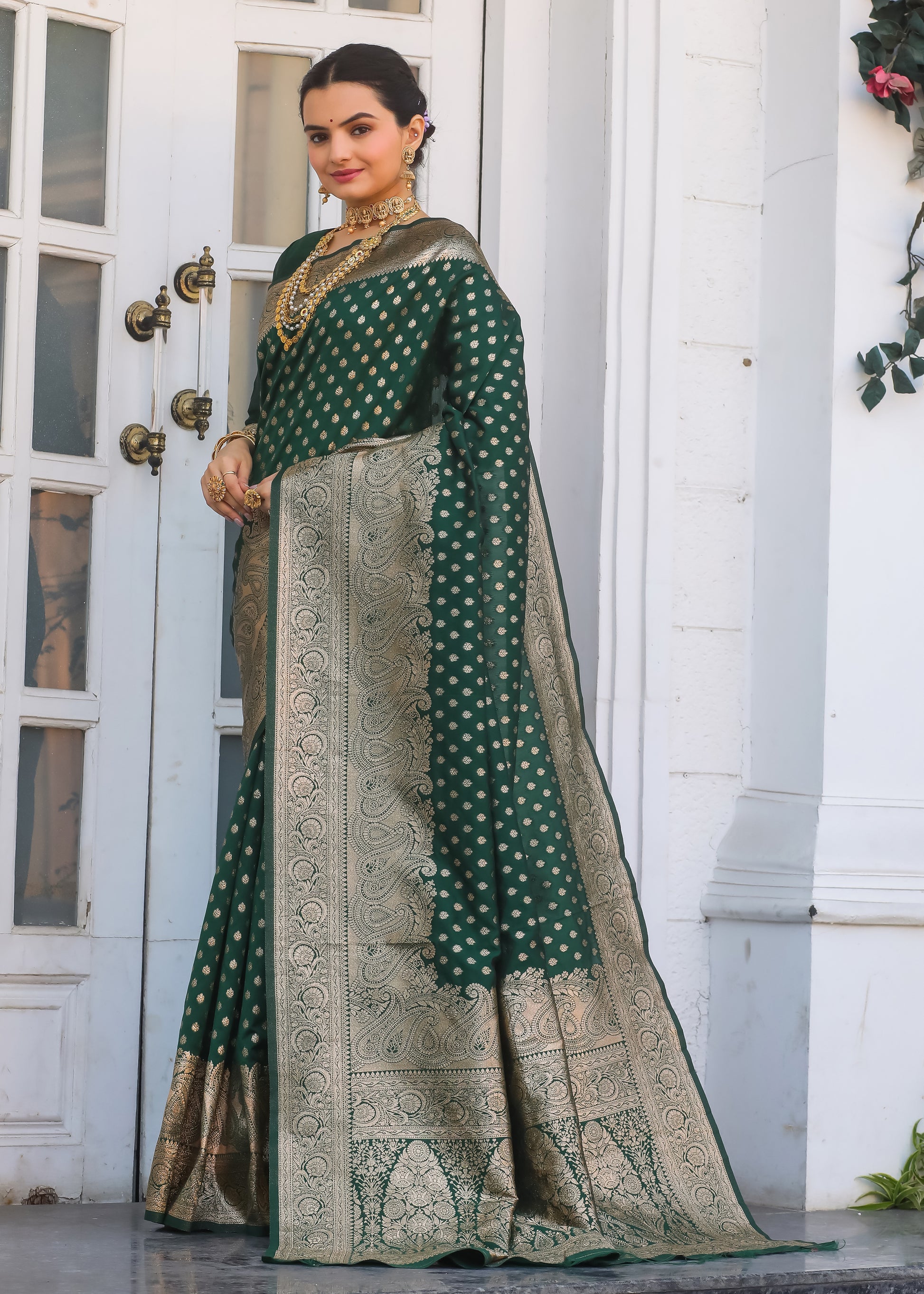 Bottle Green Katan Litchi Silk Banarasi Saree with Zari Butta Woven