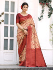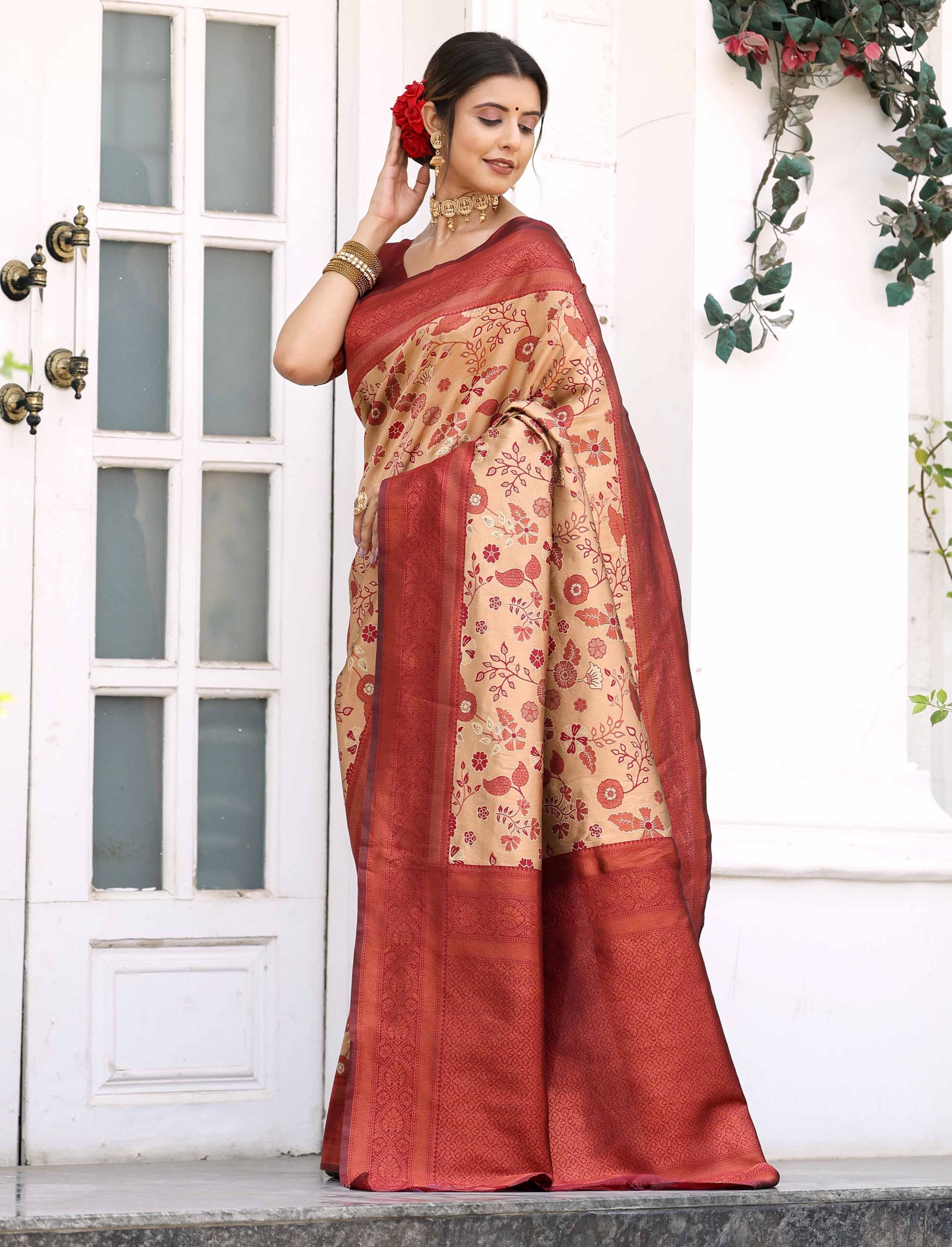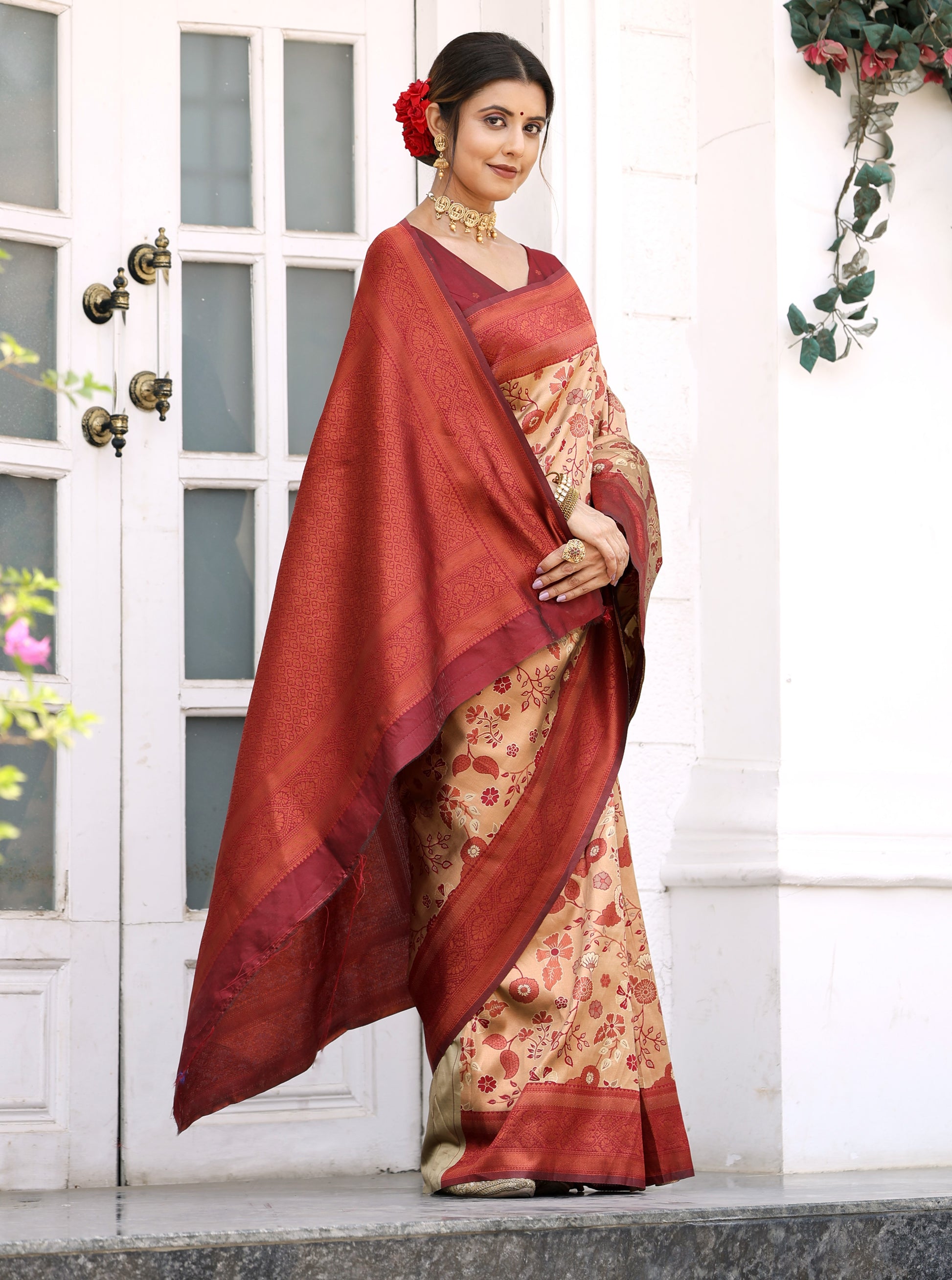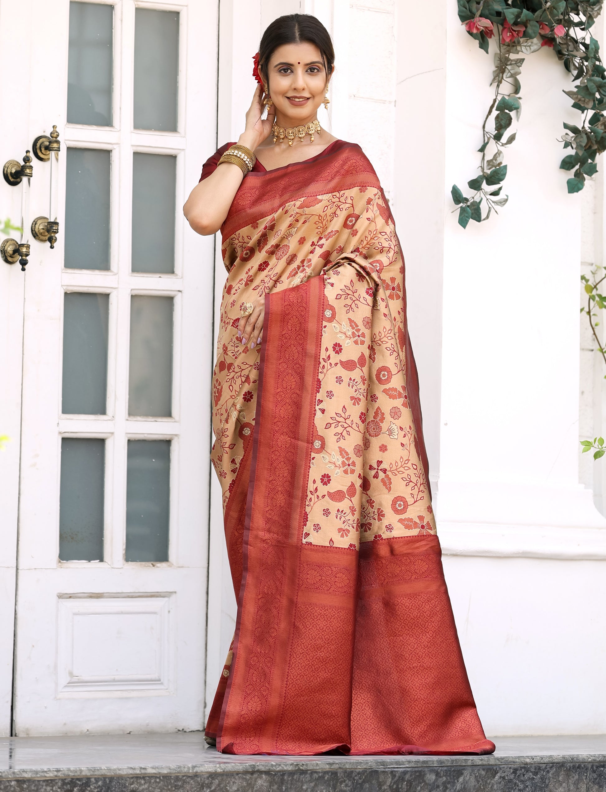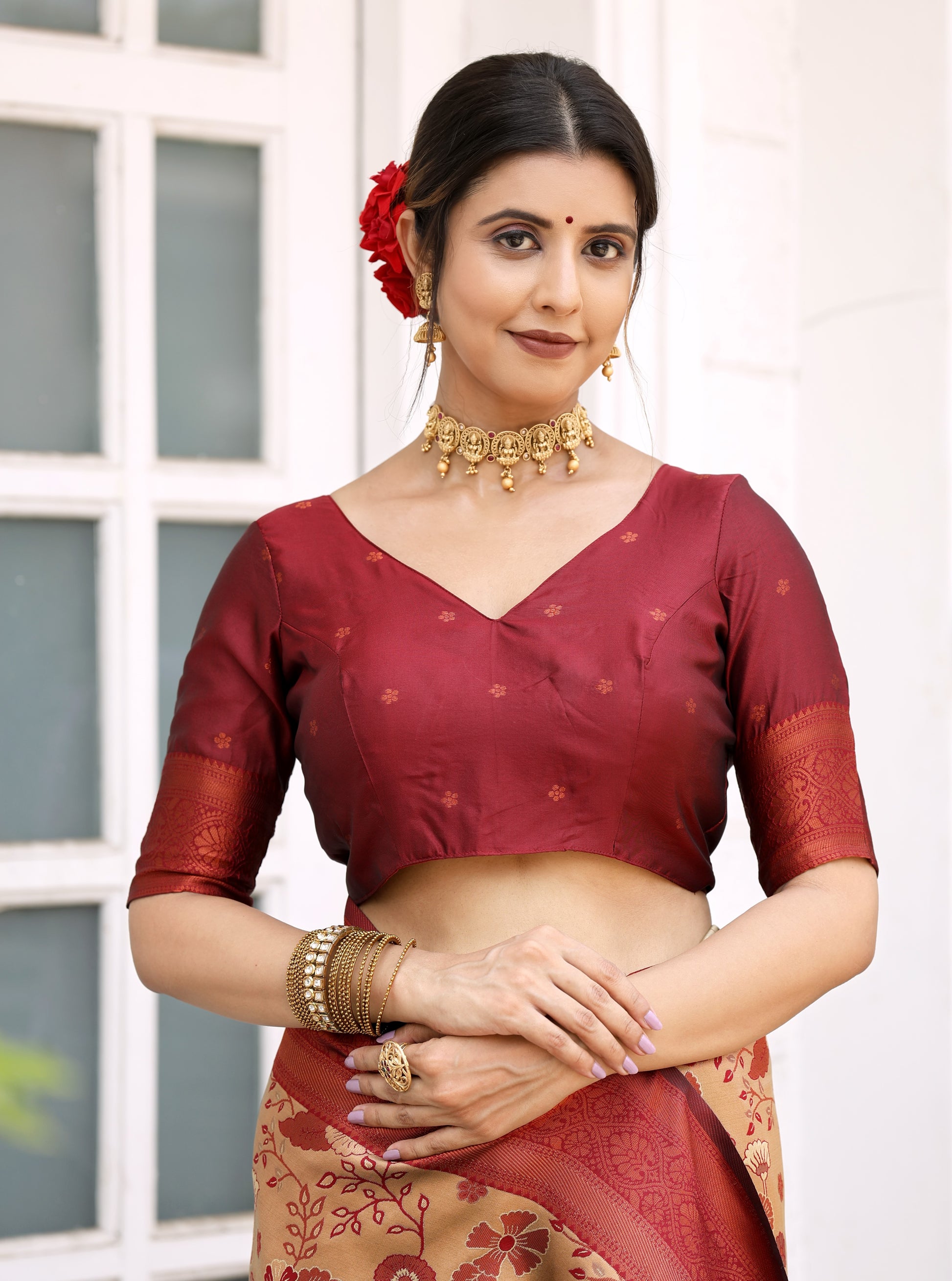 Chiku Maroon Litchi Soft Silk Banarasi Saree with Floral Zari Woven