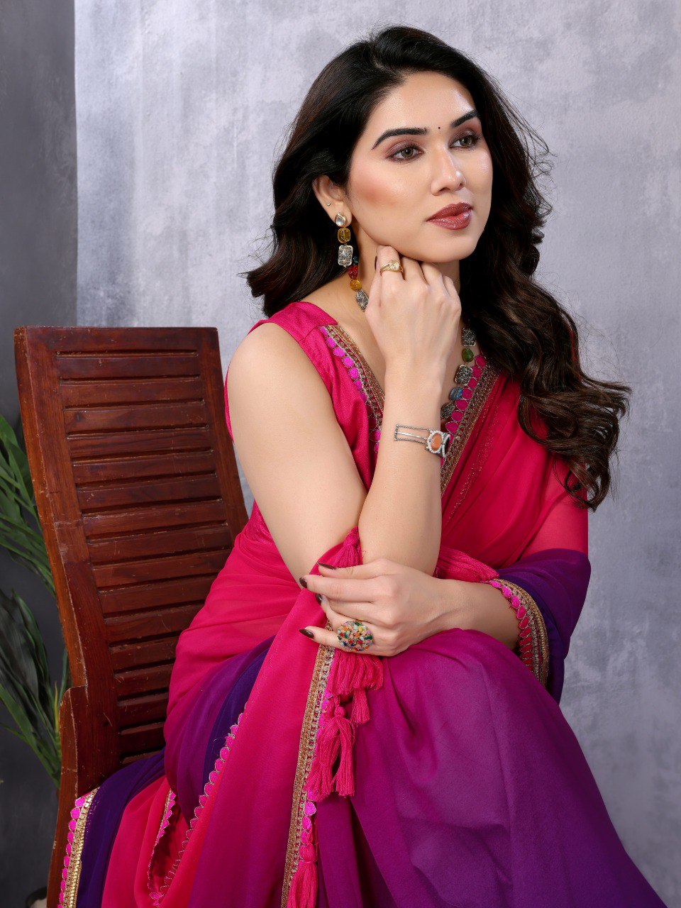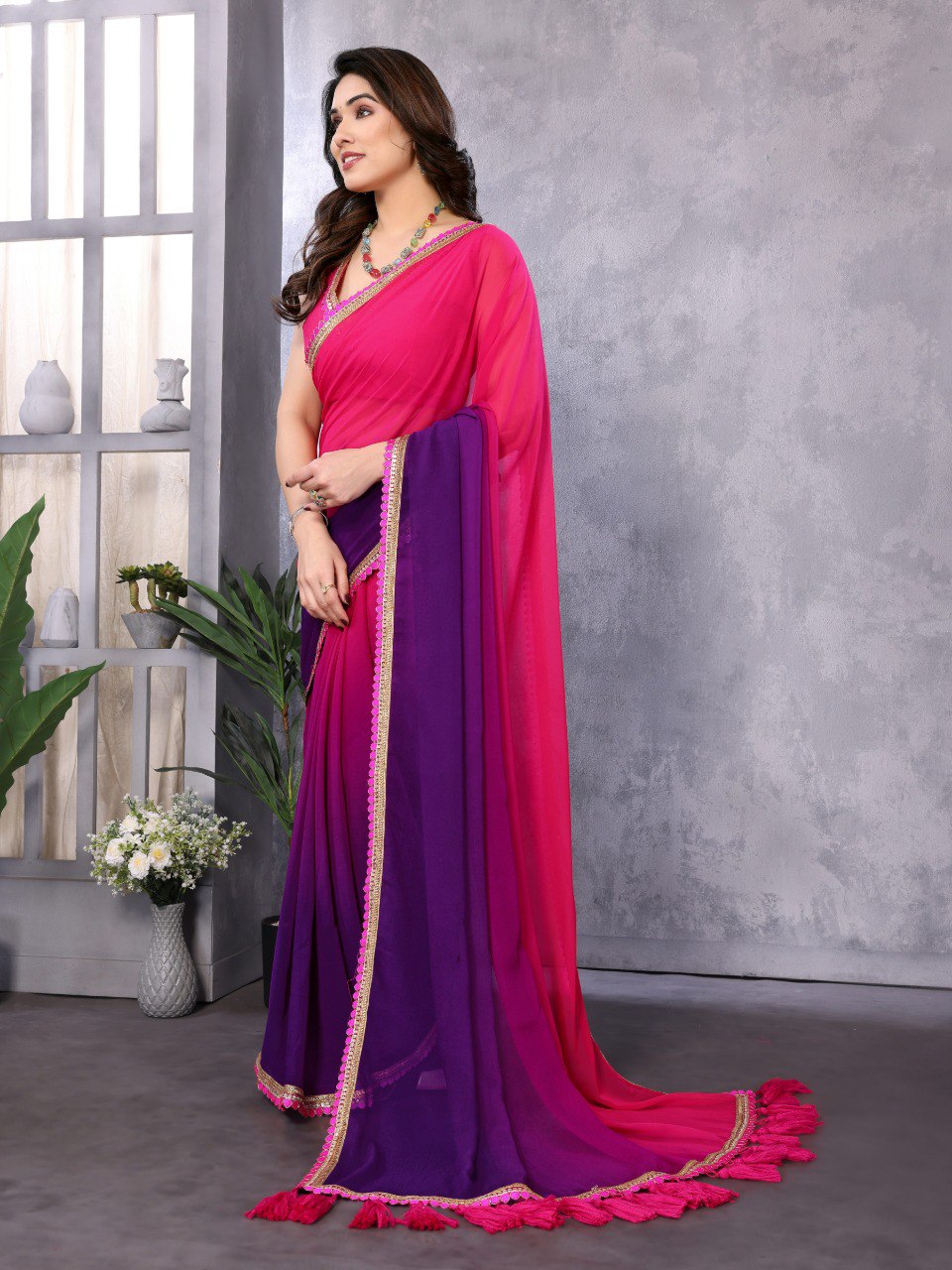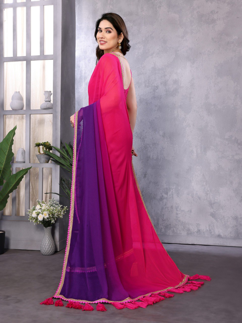 Dark Gradient Pink Faux Peding Georgette Saree with Multi-cording sequence lace and big pompoms
