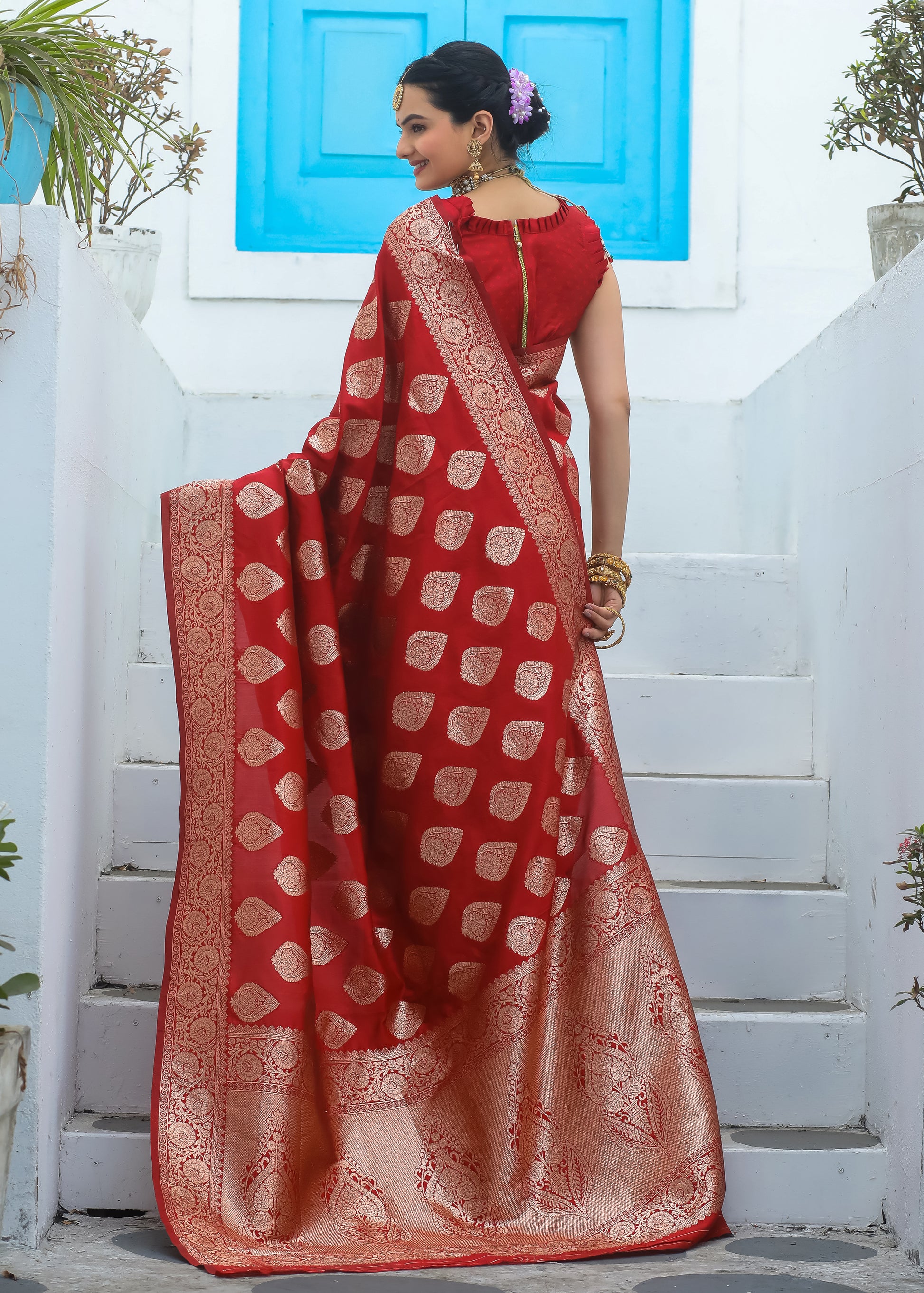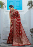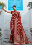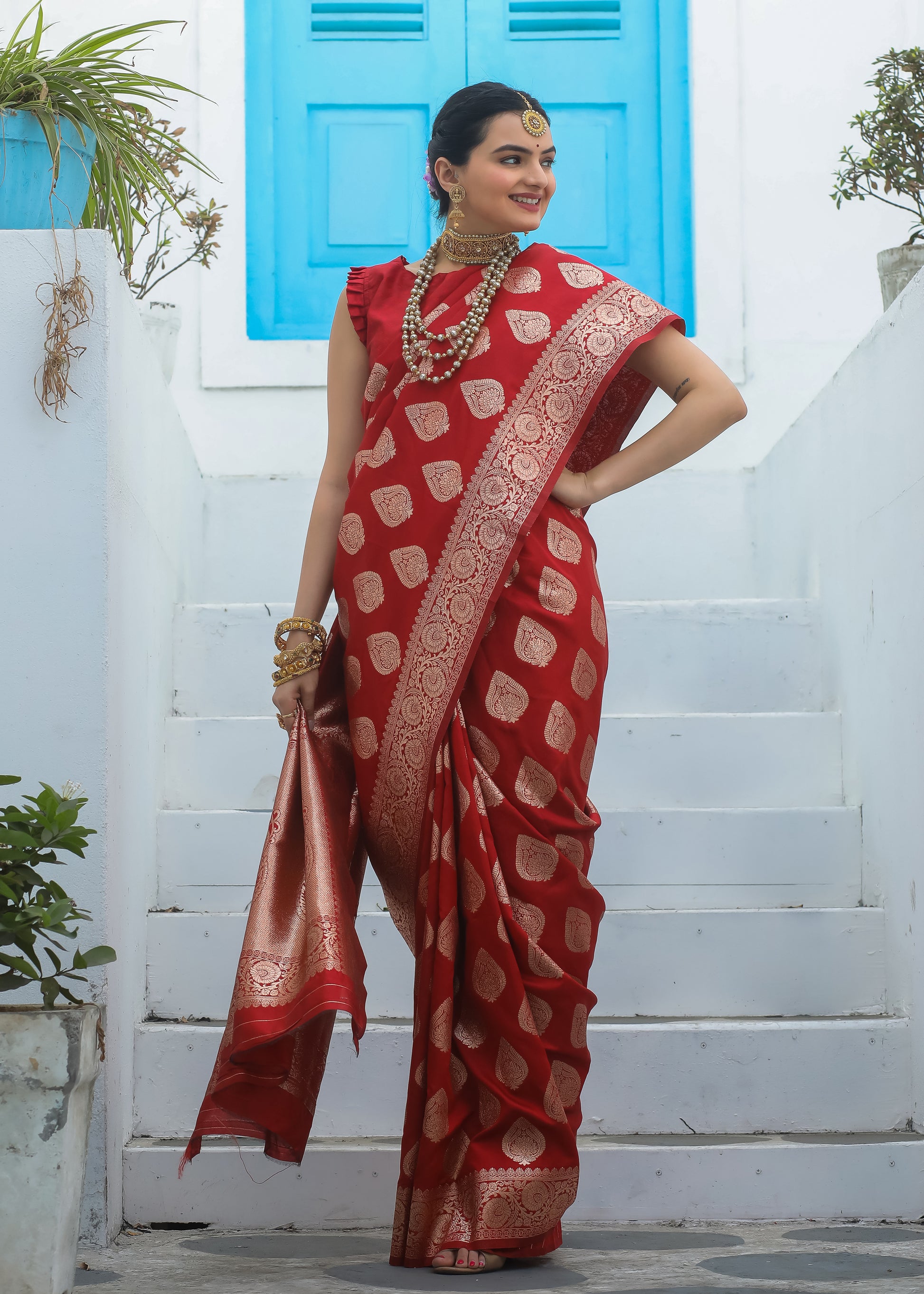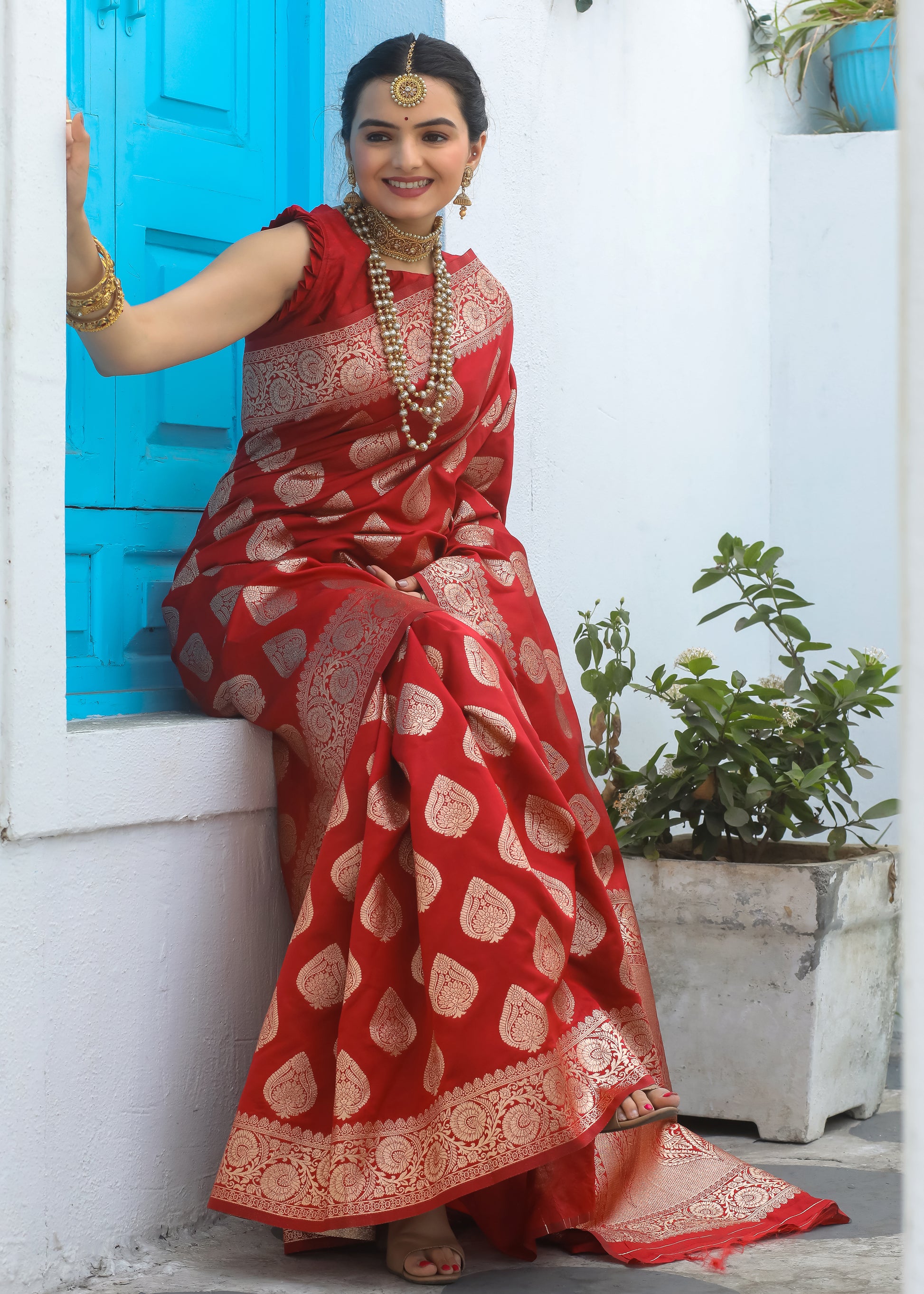 Exclusive Red Katan Litchi Silk Banarasi Saree Featuring Intricately Woven Zari Buttas