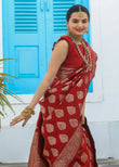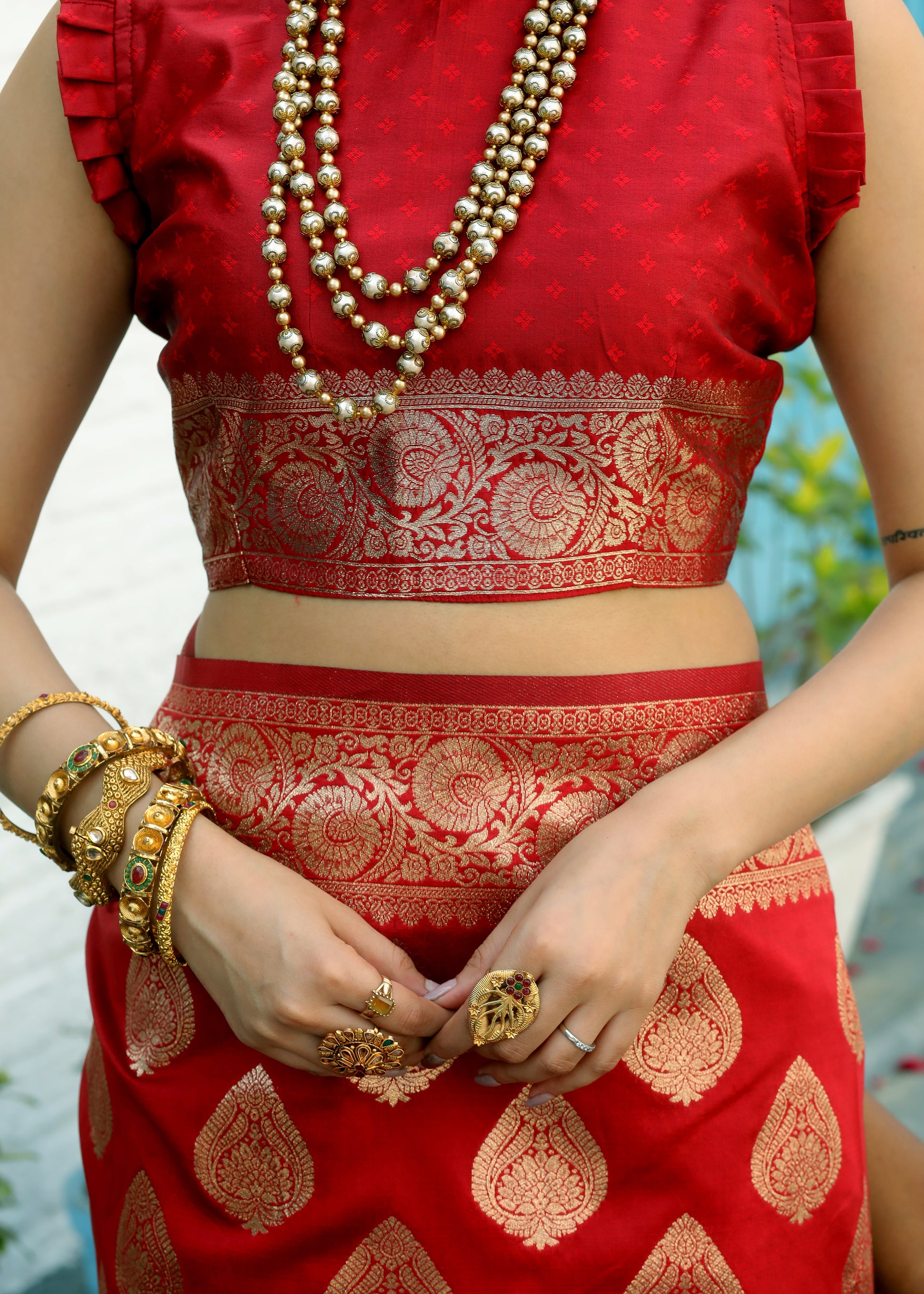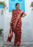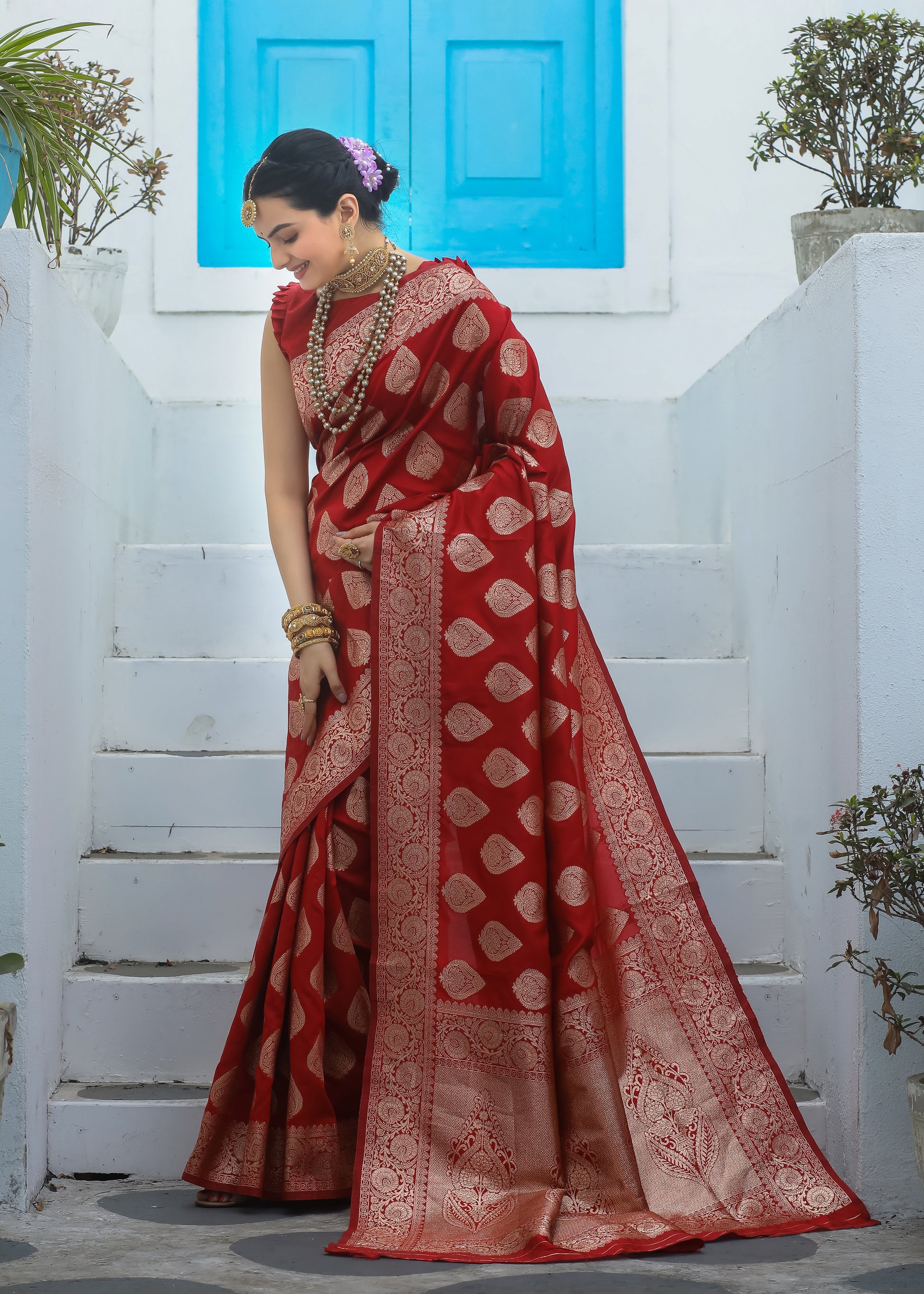 Bold and beautiful, this Red Katan Litchi Silk Banarasi Saree is adorned with finely crafted zari buttas. A perfect match for weddings and traditional Indian ceremonies.