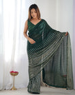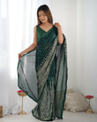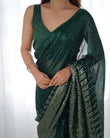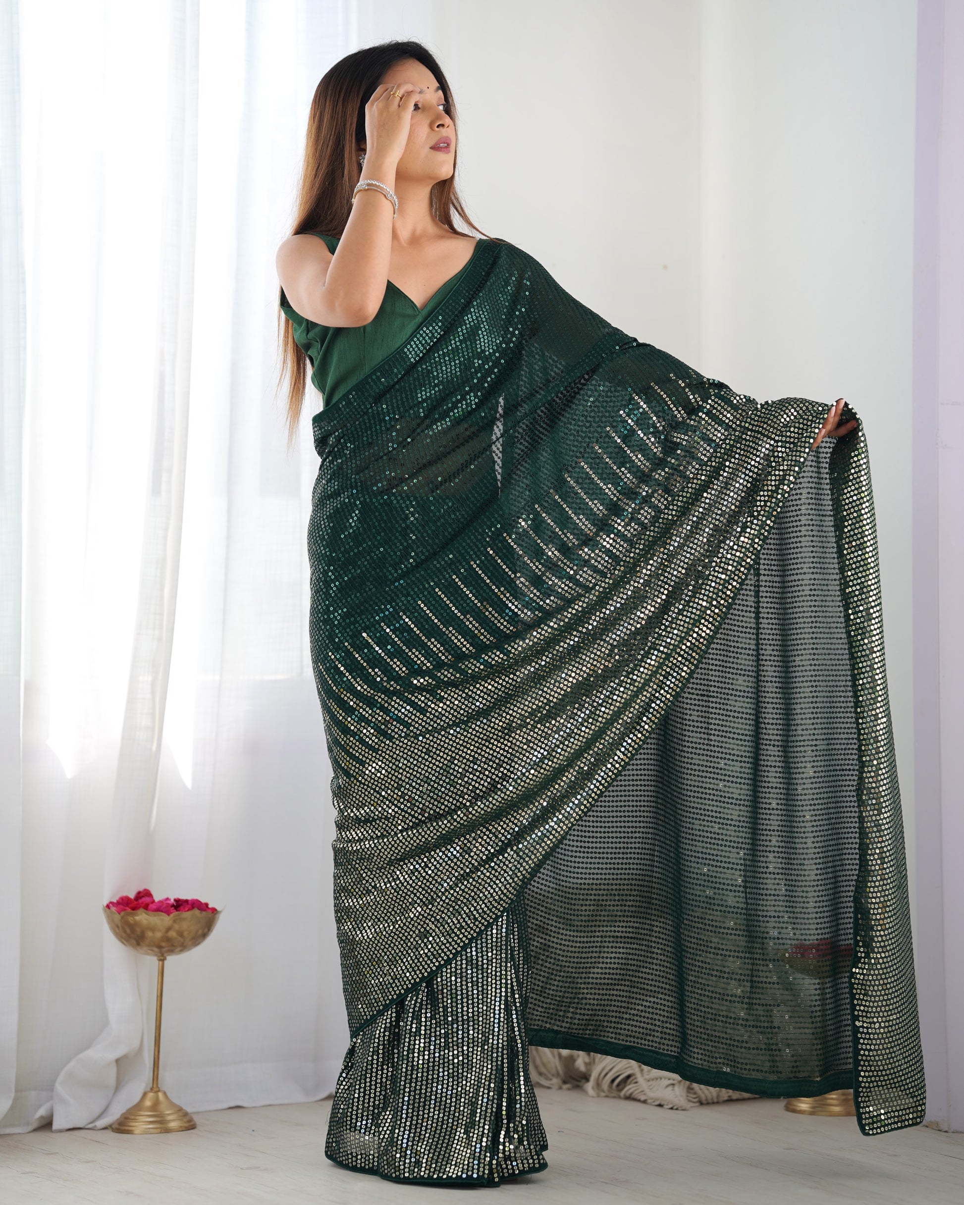 This Green Heavy Georgette Saree blends modern glam with ethnic elegance. It features double run sequence embroidery, backpatch design, and graceful piping, giving it a high-fashion finish.