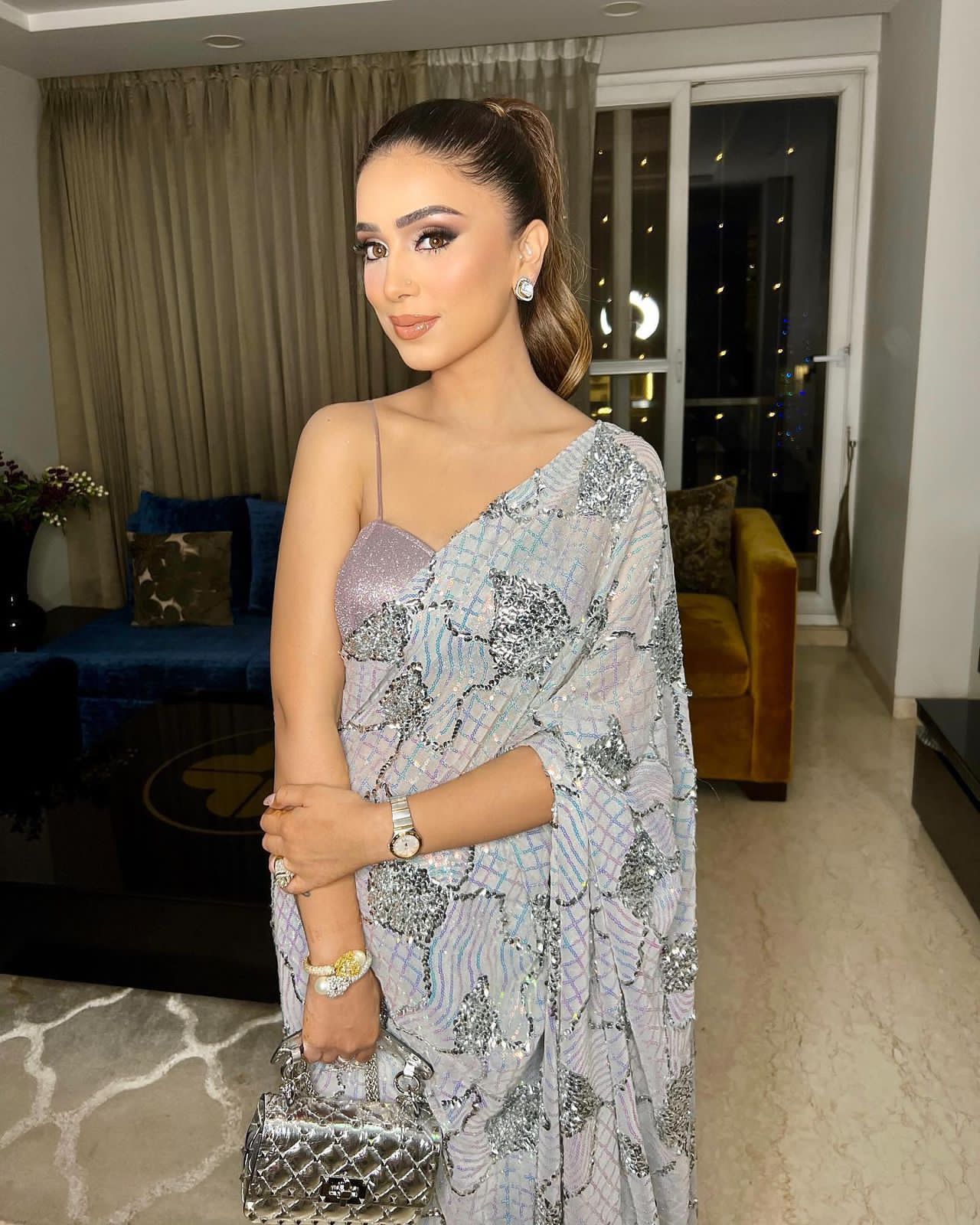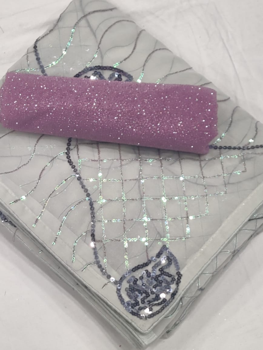 This elegant Grey Georgette Saree features dual-shade sequins work that creates a soft gradient shine, beautifully enhanced with lace piping for a refined edge. Perfect for evening wear with a twist of glam.