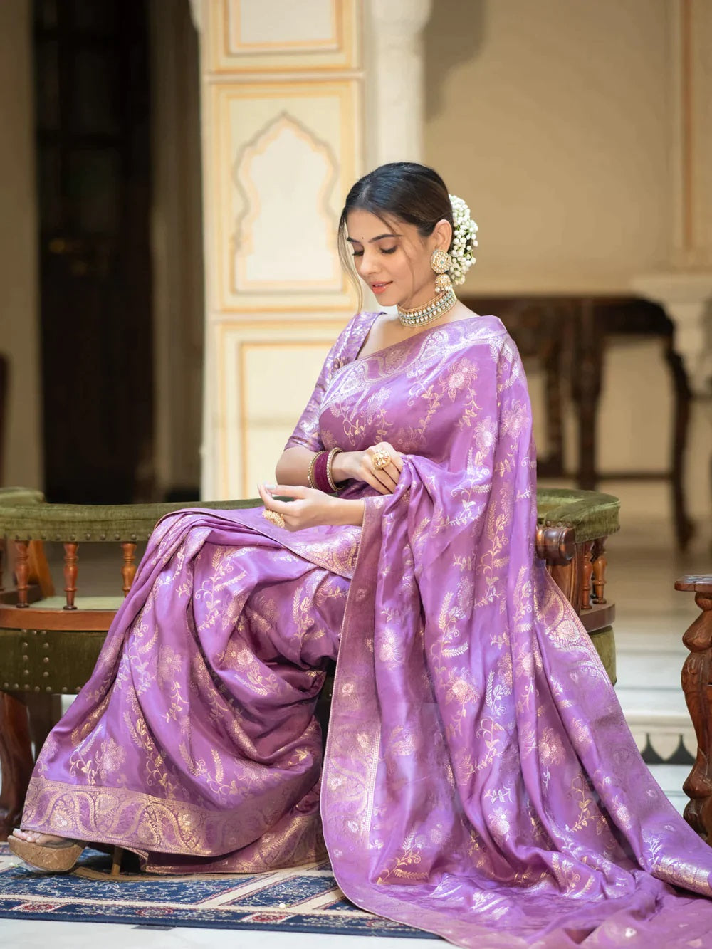 This Lavender Soft Silk Saree brings a subtle charm to traditional wear. The blend of Kanjivaram and Banarasi weaving makes it timeless, while the rich Jacquard blouse completes the royal aesthetic. Currently not in stock.