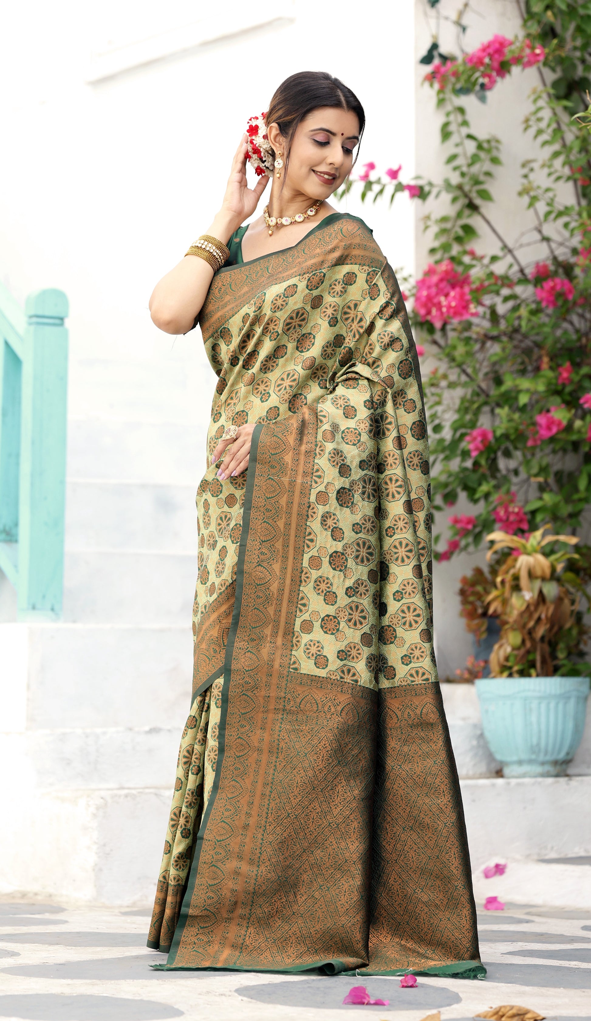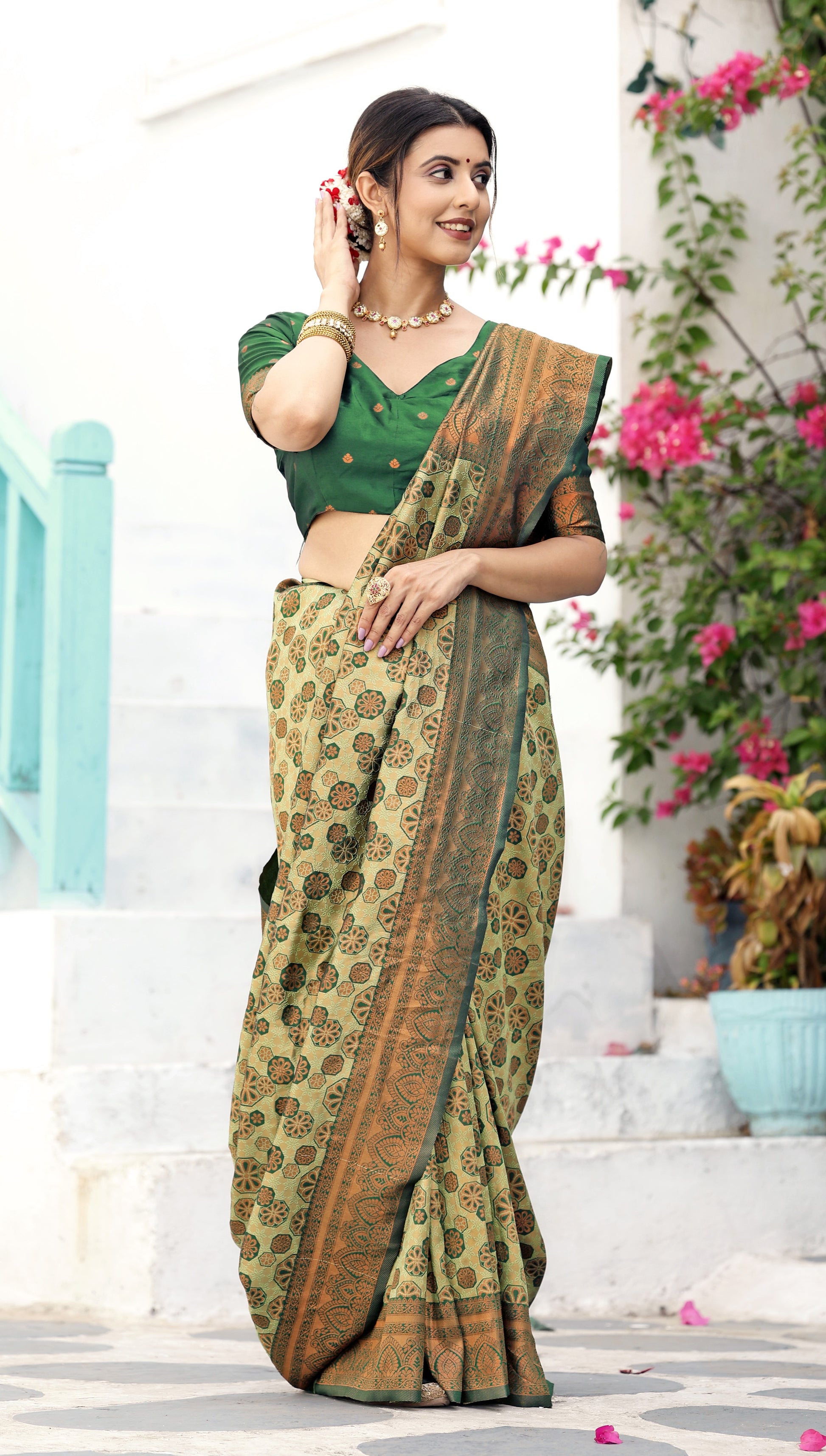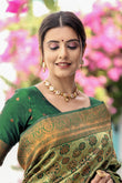 Pista Bottle Green Litchi Soft Silk Banarasi Saree with Floral Zari Woven