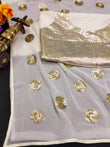 Vibrant and stylish, this Red Georgette Saree features embroidery sequence work enhanced by a crisp piping border. It’s paired with a contrasting off-white heavy mono silk blouse, making it ideal for standout festive dressing.