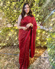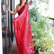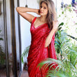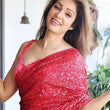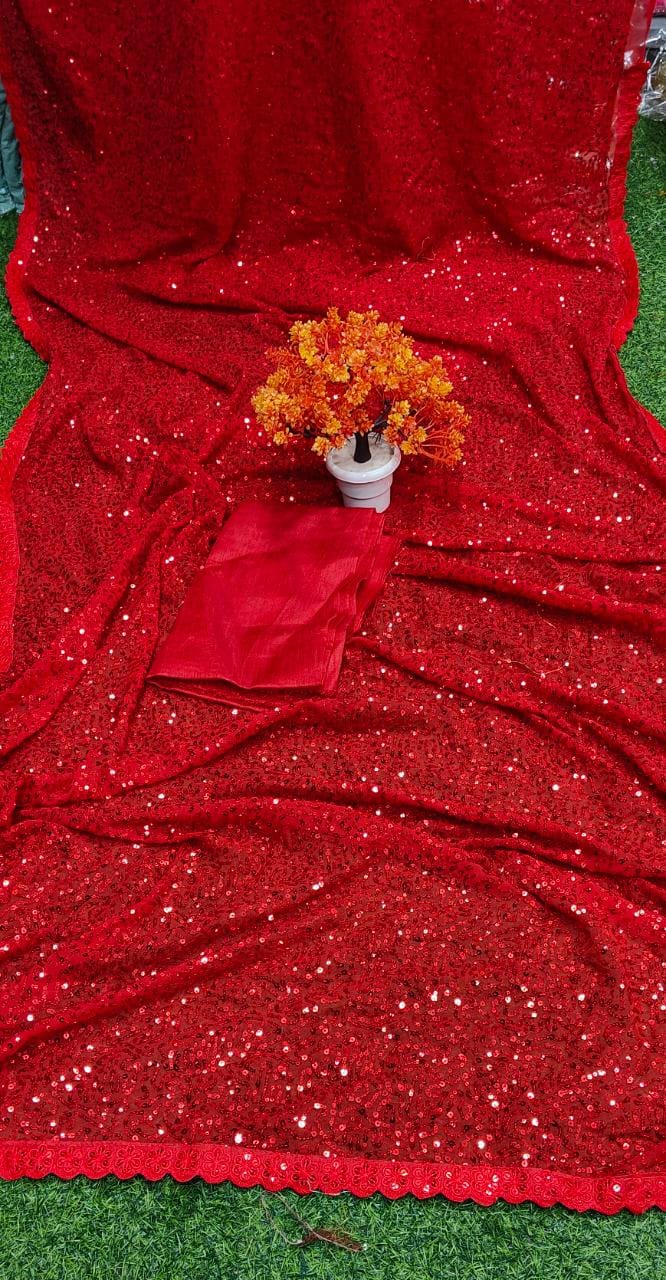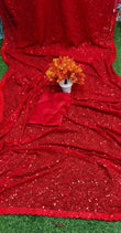 This Red Heavy Georgette Silk Saree is a masterpiece of craftsmanship featuring dual-sized 5mm & 3mm sequence embroidery and a stunning cut-work lace border. Ideal for weddings and high-end ethnic events.