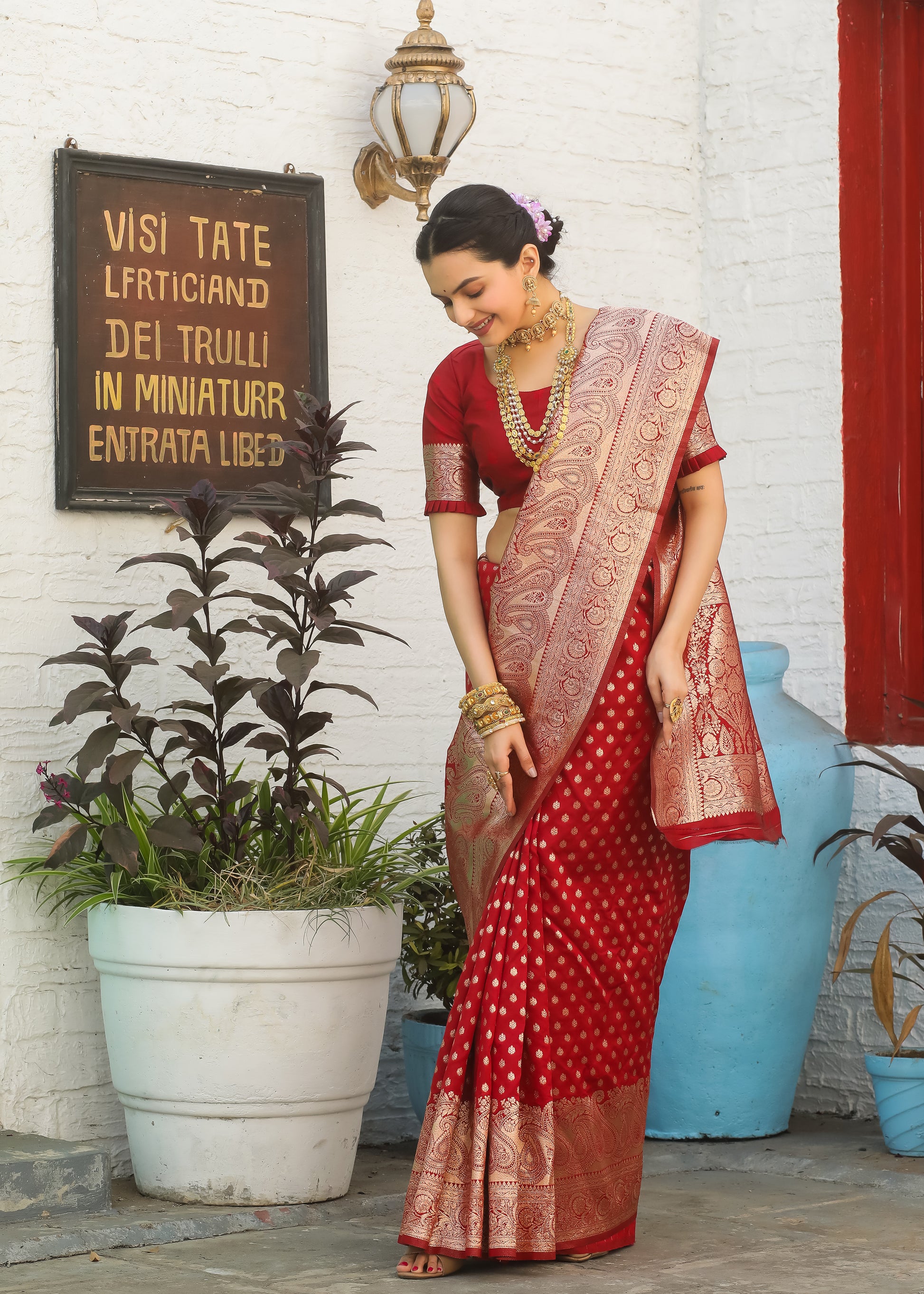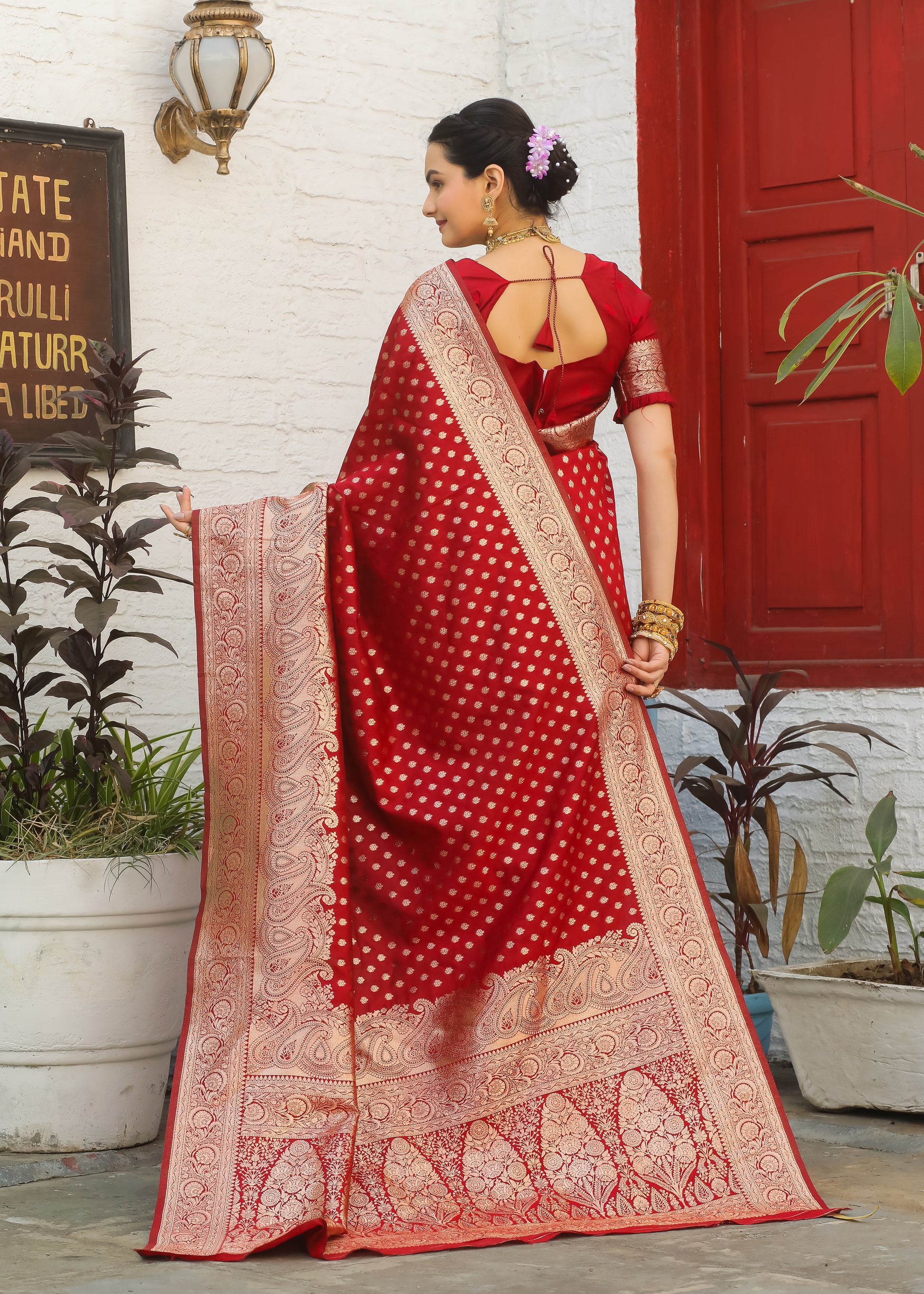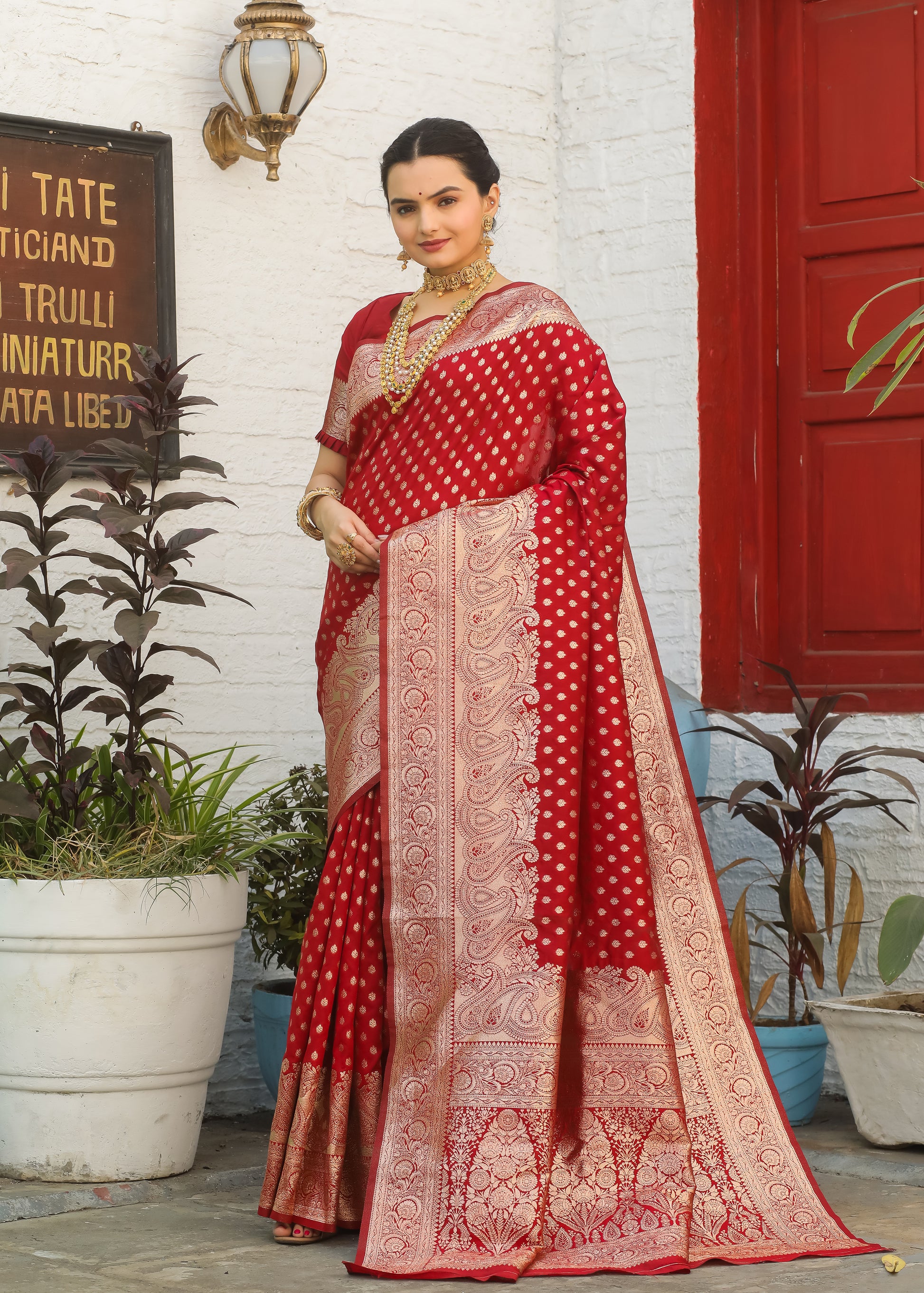 Red Katan Litchi Silk Banarasi Saree with Zari Butta Woven