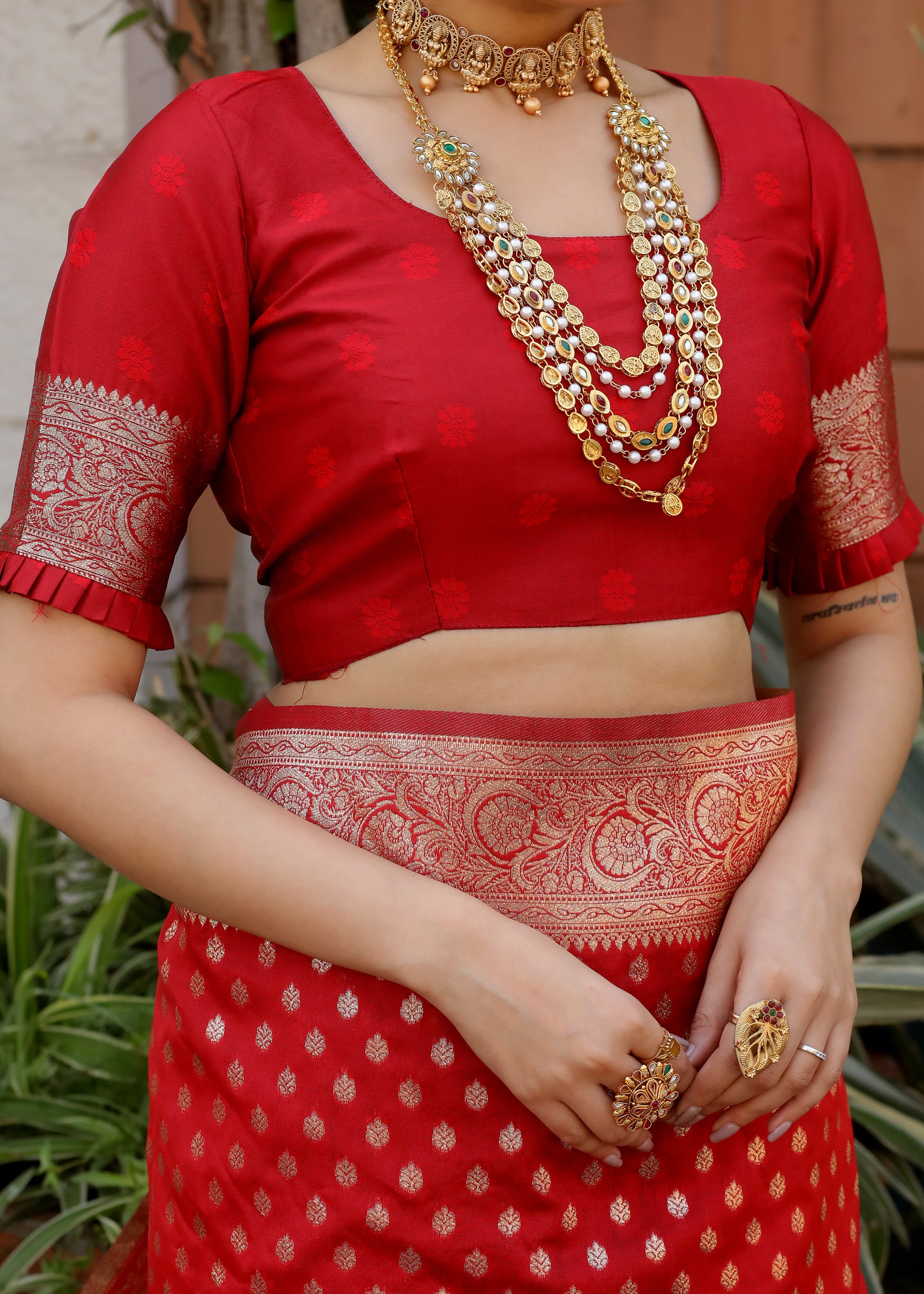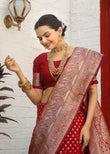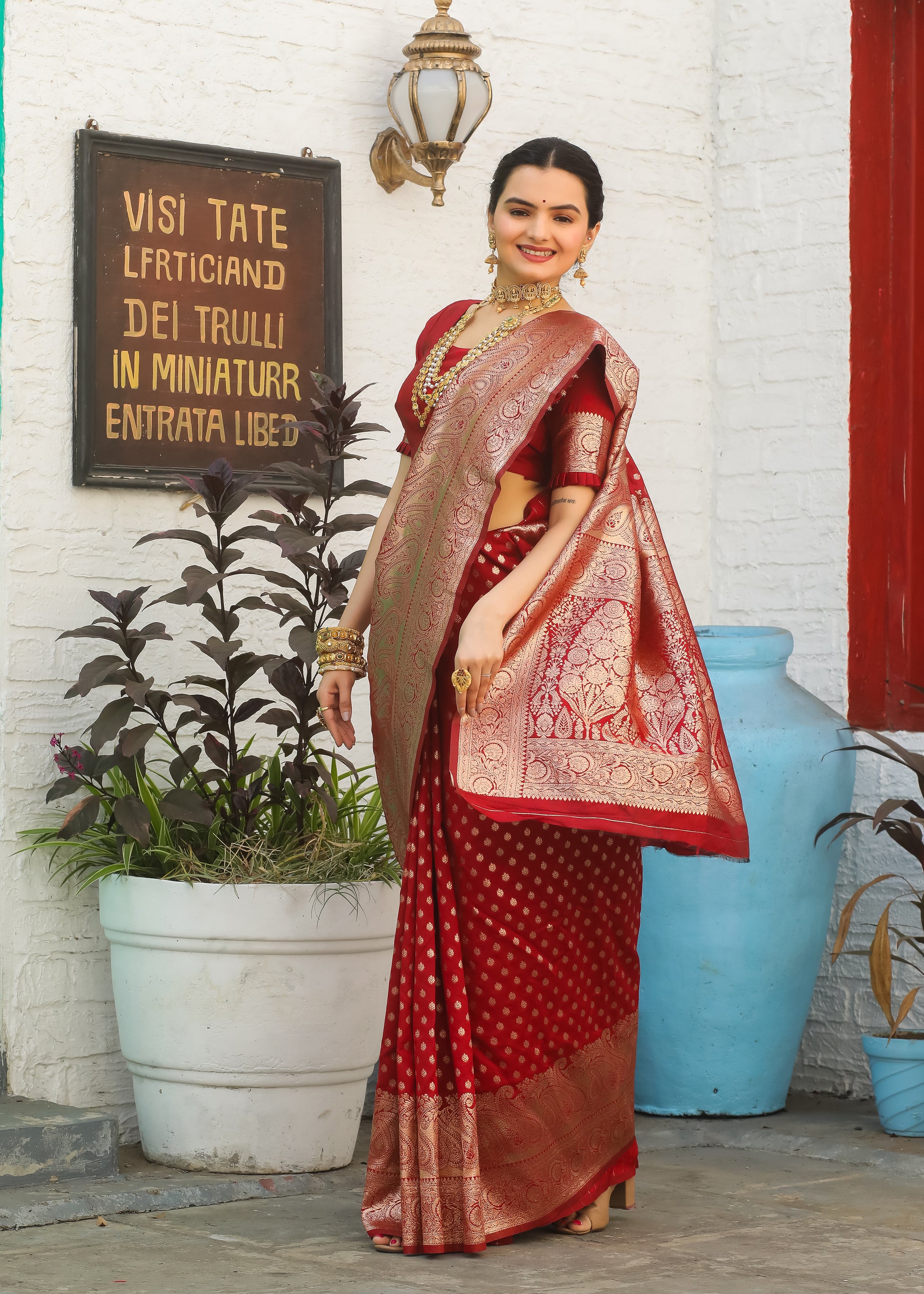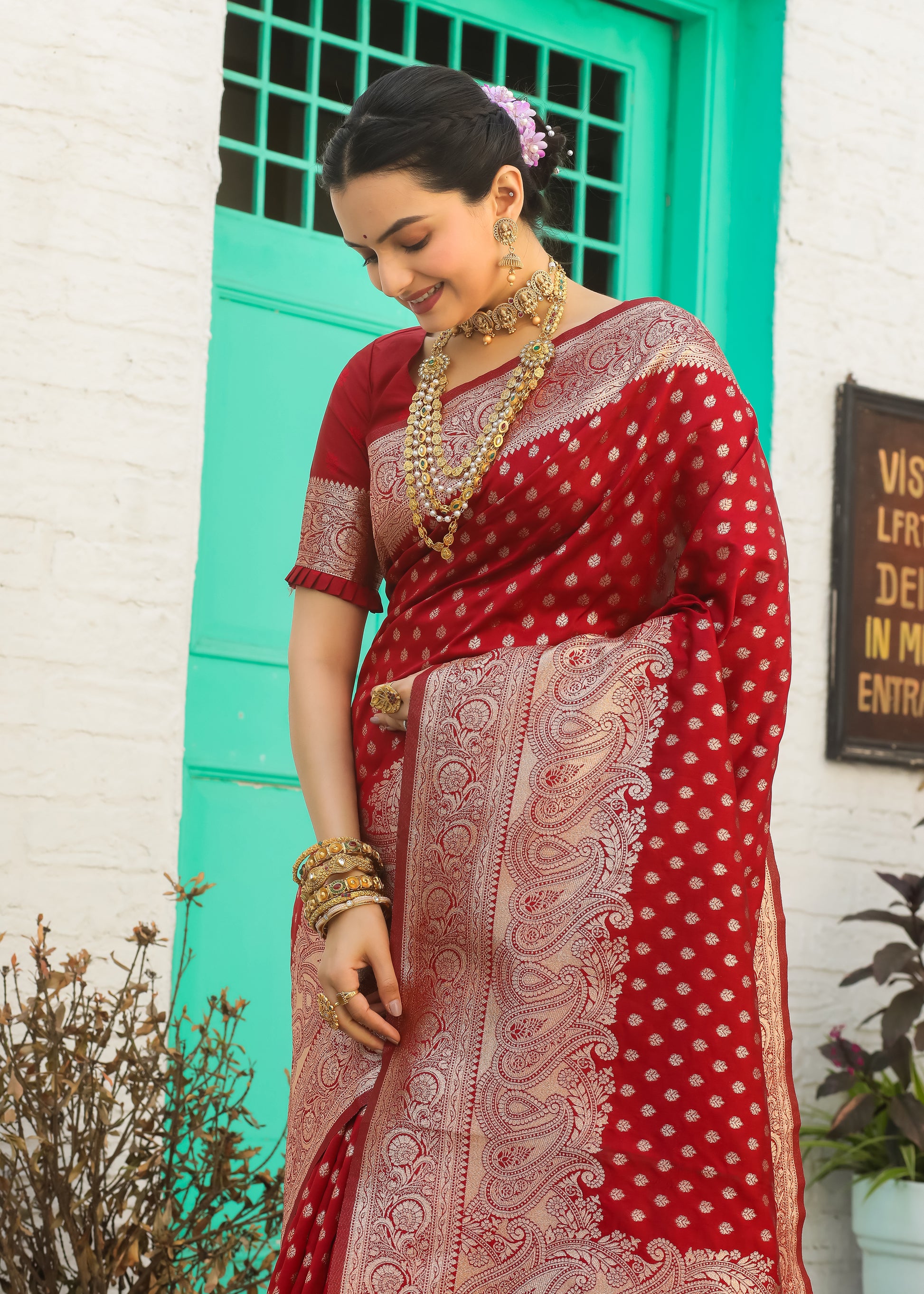 Red Katan Litchi Silk Banarasi Saree with Zari Butta Woven