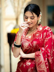 A classic Red Soft Silk Saree reimagined with Banarasi finesse and Kanjivaram motifs. Luxurious to touch and stunning to wear, especially with its heavy Jacquard blouse.
