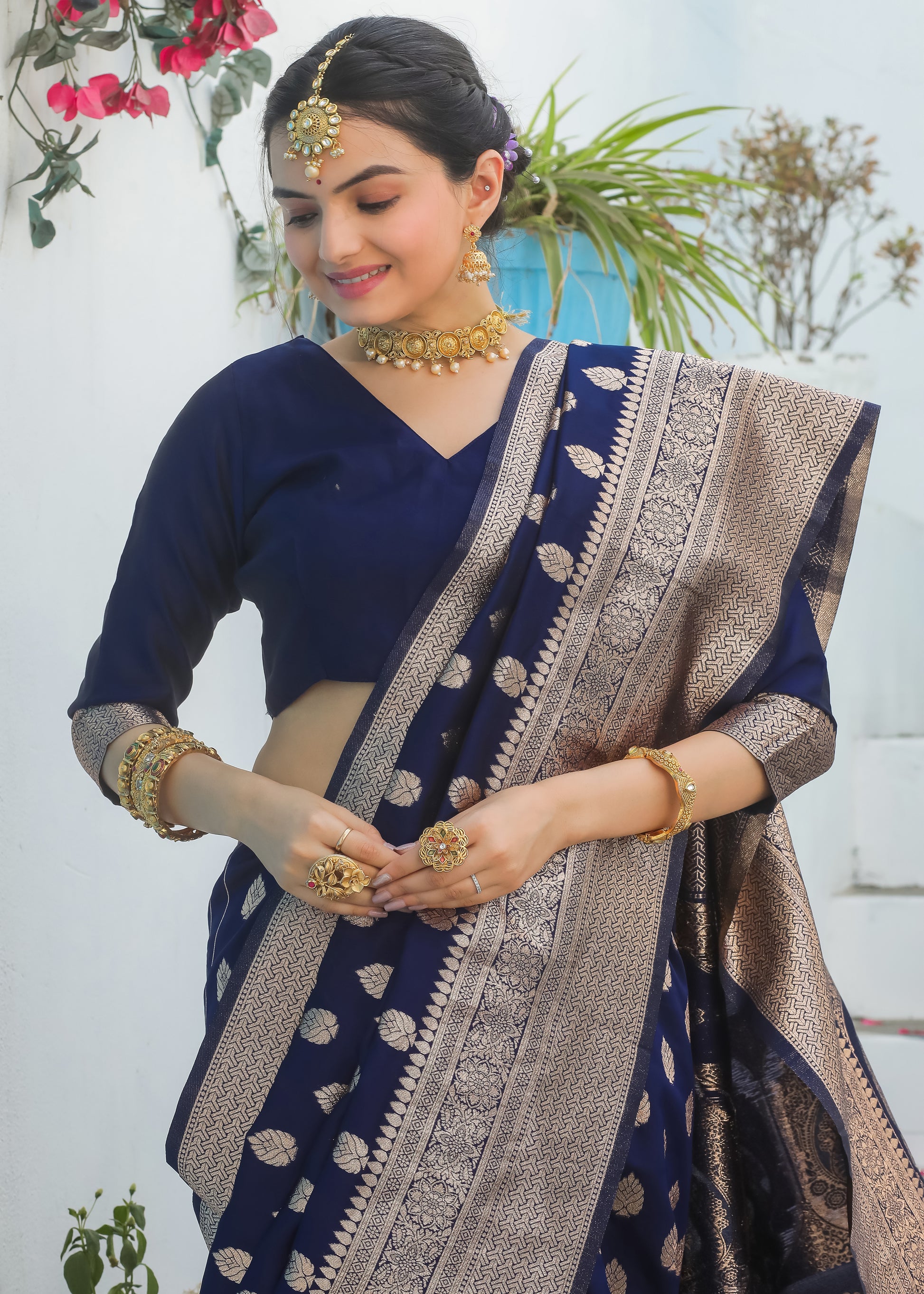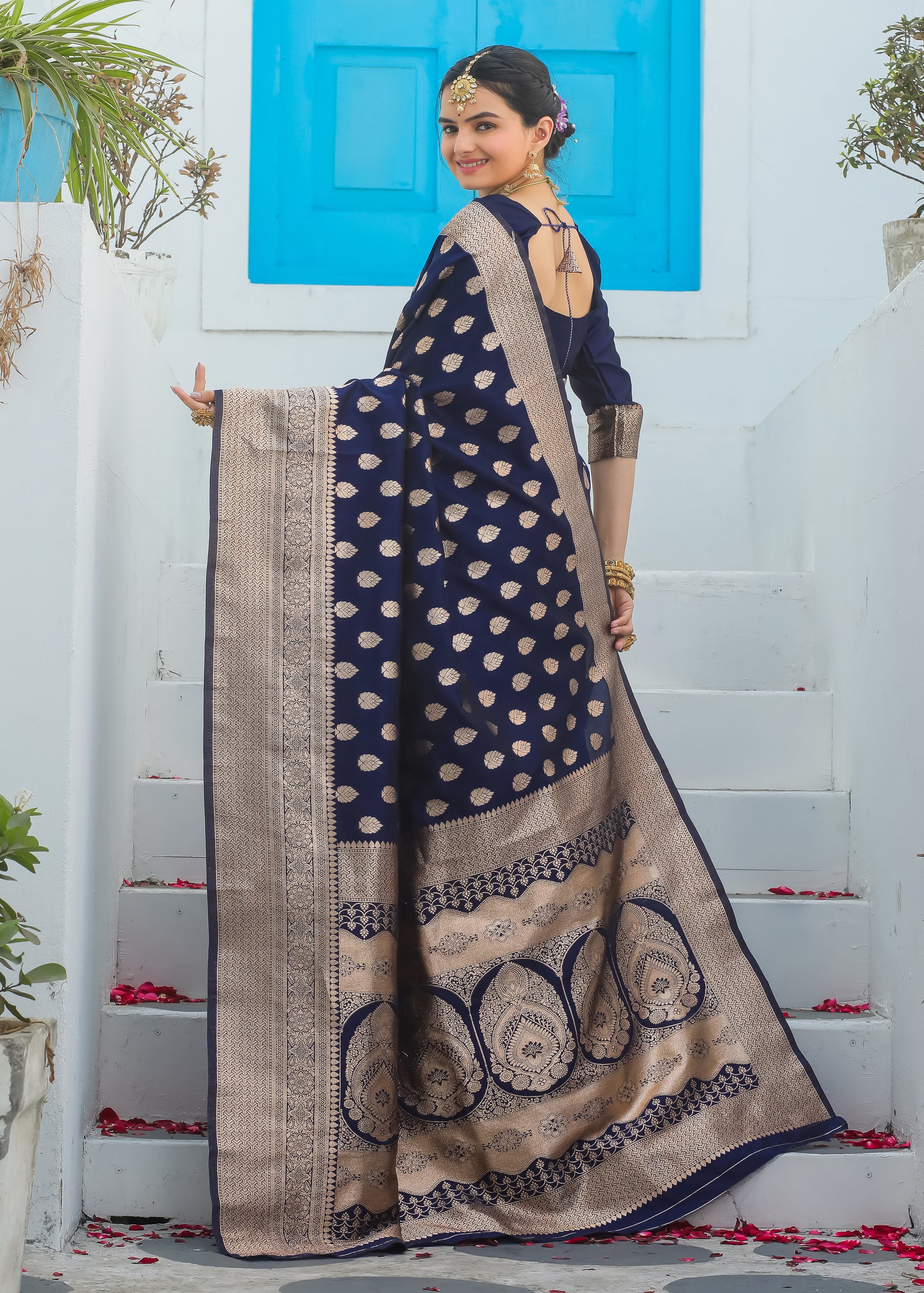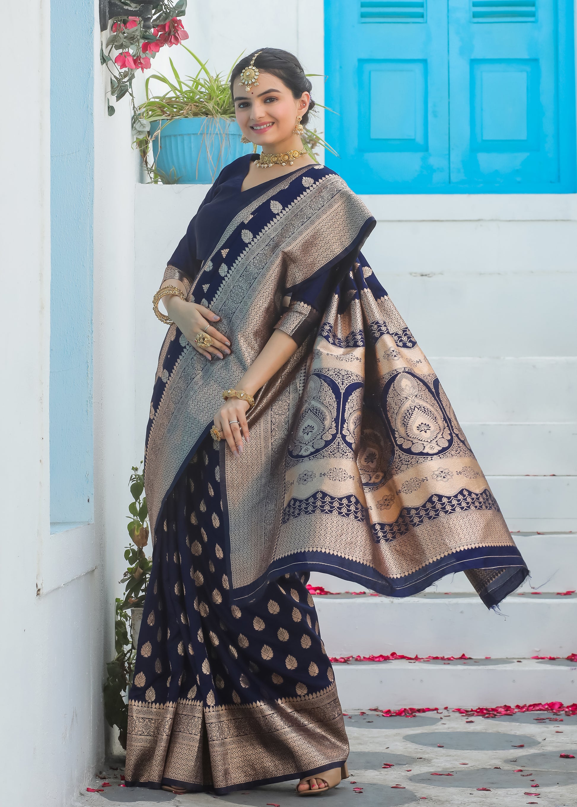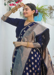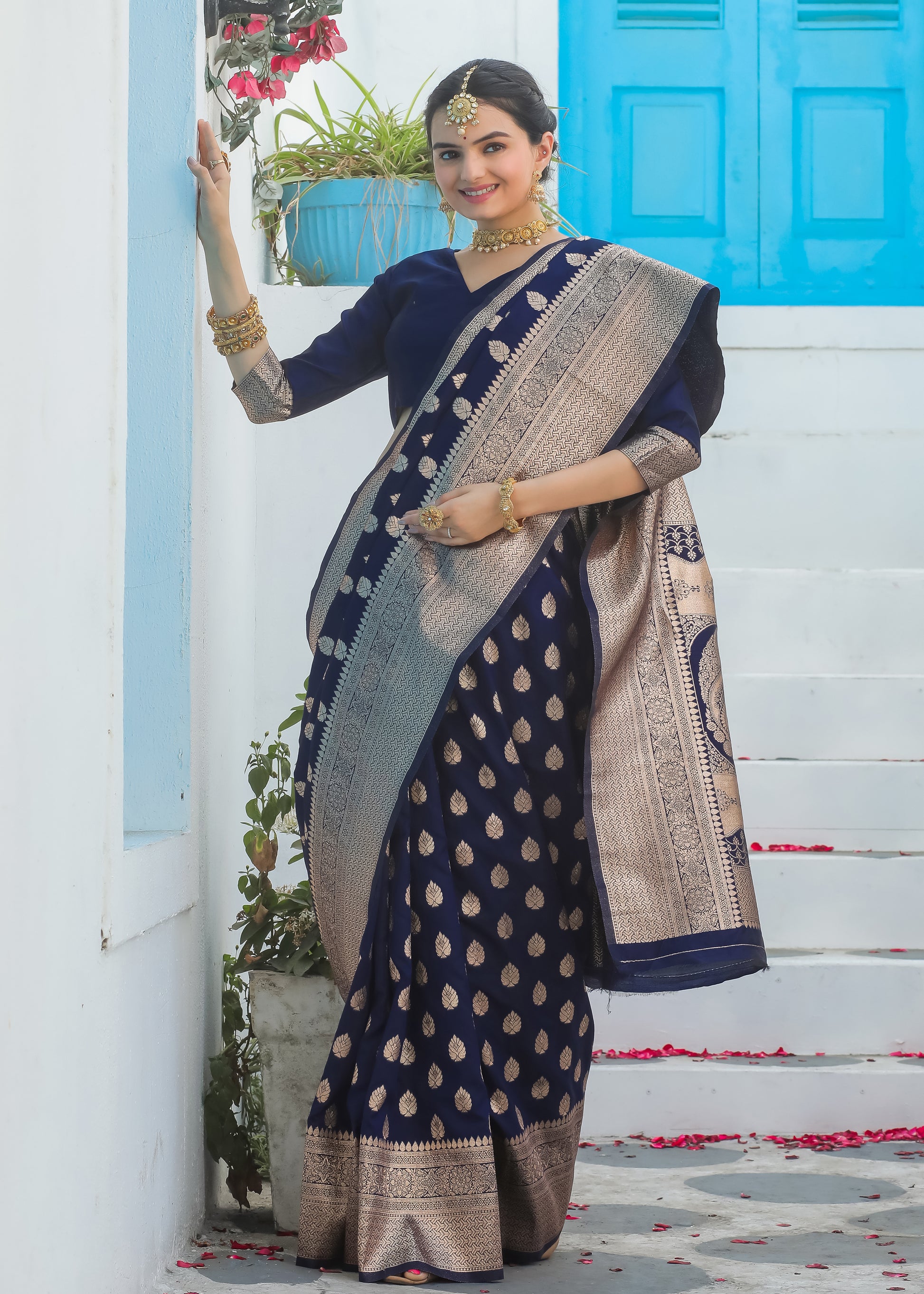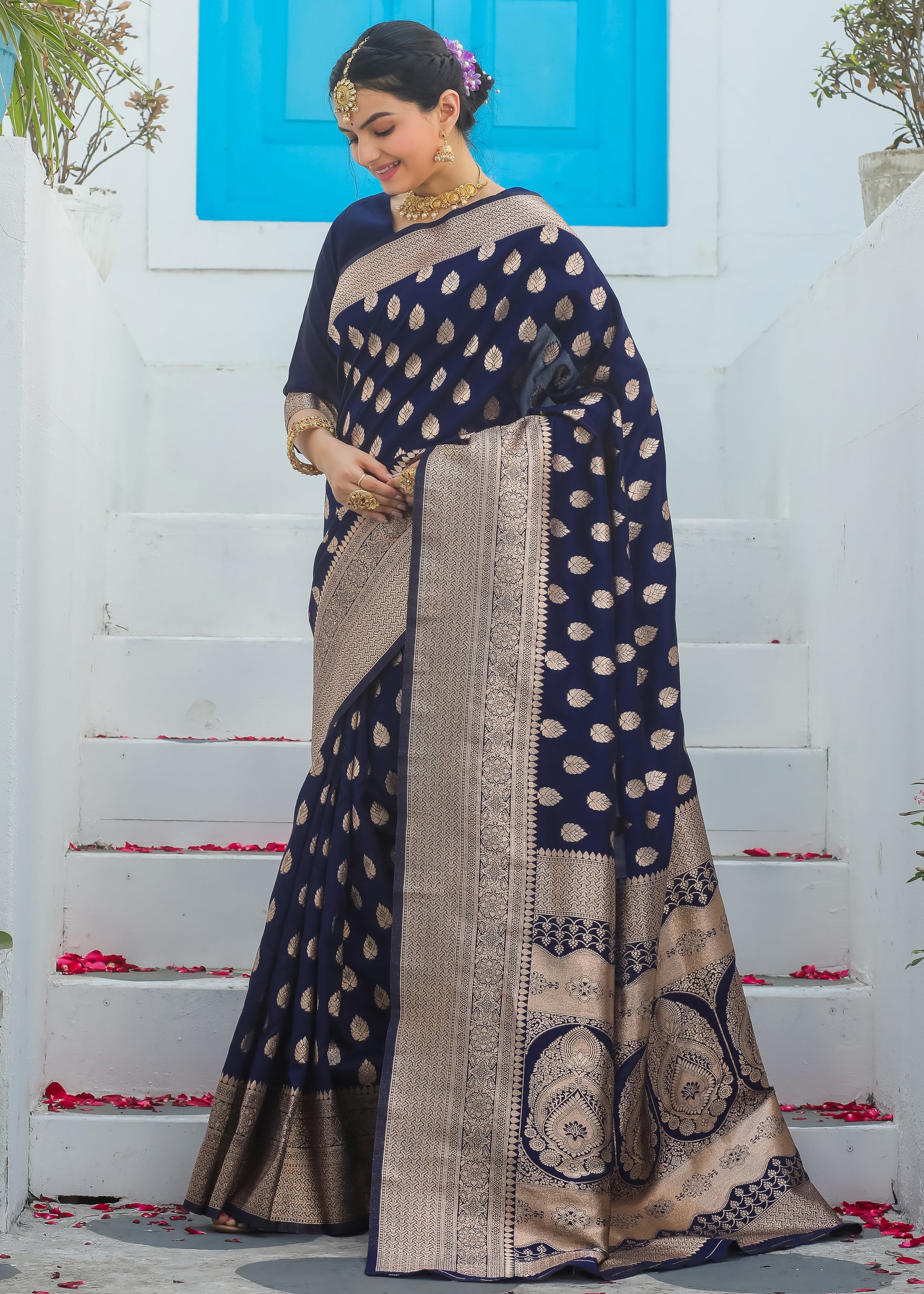 Regal Navy Blue Katan Litchi Silk Banarasi Saree Enhanced with Rich Zari Butta Work