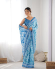 This Sky Blue Heavy Chinnon Saree brings fresh charm to traditional attire. Featuring elegant print work and a Kutchi mirror lace border, it's a standout option for daytime festivities and ethnic gatherings.