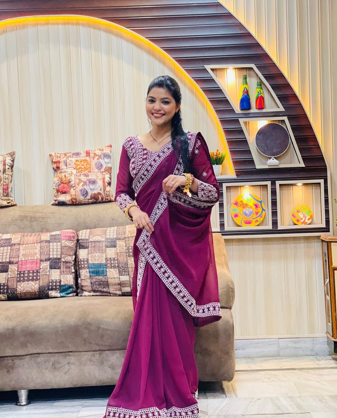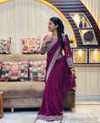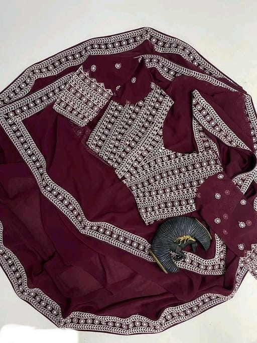This rich Wine Heavy Georgette Saree is delicately embroidered across the body, offering understated glamour with a classic finish. Comes with an embroidered heavy mono silk blouse with sleeves.